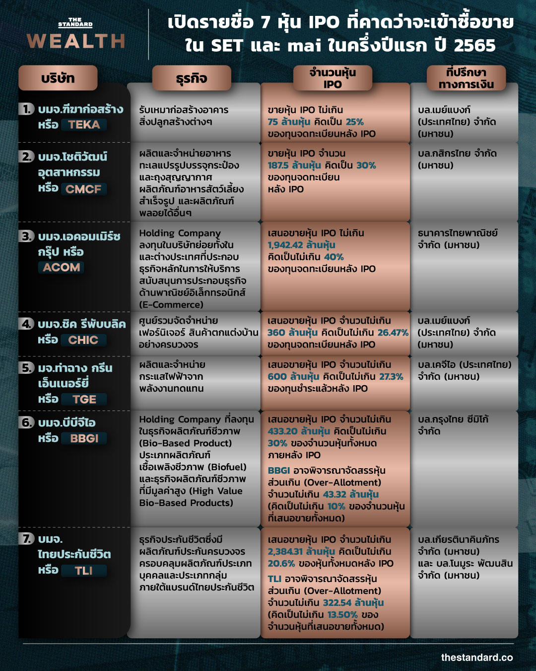 โดยจากการสำรวจพบว่า 7 บริษัทเตรียมเสนอขายหุ้น IPO และเข้าซื้อขายใน SET และ mai ภายในครึ่งปีแรกปี 2565 ประกอบด้วย