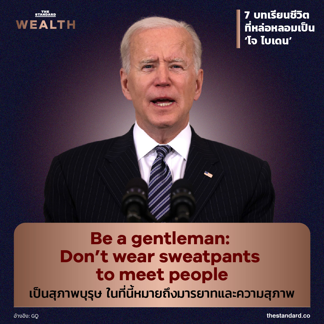 เป็นสุภาพบุรุษ โดยแนวคิดนี้เป็นสิ่งที่ไบเดนได้รับการปลูกฝังจากผู้เป็นพ่อ ซึ่งไบเดนอธิบายว่า สุภาพบุรุษ ในที่นี้หมายถึงมารยาทและความสุภาพ เช่น เจ้าตัวจะไม่ต้อนรับแขกในชุดกางเกงวอร์มเด็ดขาด หรือต้องเตรียมน้ำชาและของว่างไว้คอยต้อนรับแขกอยู่เสมอ