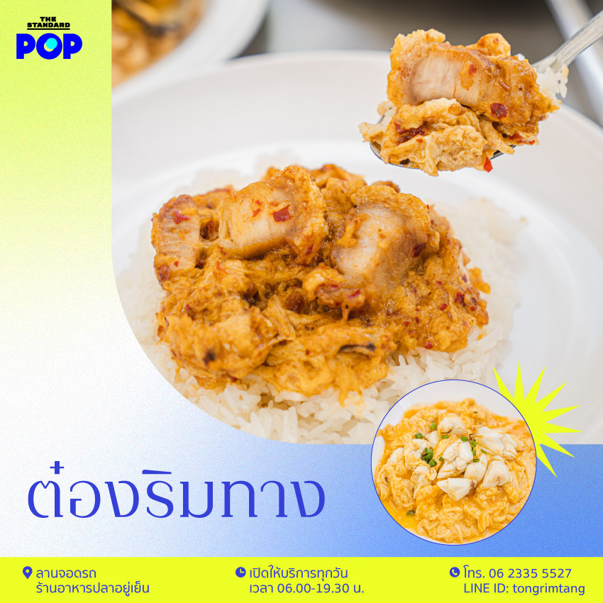 ร้านแรกเด็ดดังในย่านนี้ต้องยกให้กับ ‘ต๋องริมทาง’ สตรีทฟู้ดระดับภัตตาคาร ตั้งอยู่หน้าโครงการปลาอยู่เย็น อาหารราคาสบายกระเป๋าที่ใช้วัตถุดิบเกรดเอเหมือนยกทะเลมาตั้งไว้ในย่านราชพฤกษ์ ทั้งเนื้อปู กุ้ง หอย ปลาหมึก สดและสะอาด มีทั้งเมนูอาหารตามสั่งและเมนูเอกลักษณ์สูตรลับเฉพาะร้าน มีให้เลือกเยอะมากเกือบ 100 เมนู แต่เมนูที่มาแล้วต้องลองคือ เนื้อปูก้อนไข่ข้น (290 บาท) เห็นก้อนเนื้อปูอวบๆ ขาวๆ แล้วน้ำลายสอ เพราะเนื้อปูมาเป็นก้อนพร้อมไข่ข้นเยิ้มๆ กึ่งสุกกึ่งดิบ กินกับน้ำจิ้มซีฟู้ดเพิ่มรสจัดจ้าน อีกจานคือ โบ๋กรอบราดข้าว (60 บาท) หมูกรอบที่ร้านใช้เครื่องอบทำเองเฉพาะ ผัดกับพริกเผารสจัดจ้าน เป็นเมนูง่ายๆ ควรลองมากๆ อีกหนึ่งจานของทางร้าน