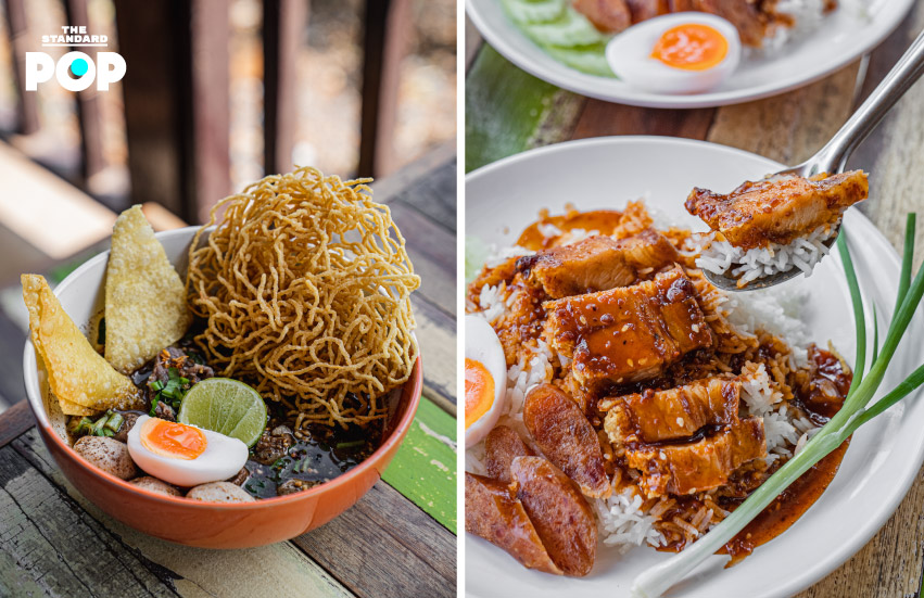 ไม่ใช่แค่เมนูก๋วยเตี๋ยวที่เด็ด ข้าวหมูแดง-หมูกรอบ (50 บาท) ก็ดีงามไม่แพ้กัน โดยสูตรหมูแดงของทางร้านจะนำหมูไปหมัก 2 คืนก่อนนำไปย่าง ย่างแบบให้มีความนุ่ม ฉ่ำน้ำนิดๆ ไม่แห้งแข็งจนเกินไป ส่วนน้ำราดสูตรของทางร้านไม่หวานเกินไป หอมกลิ่นถั่วติดปลายลิ้น