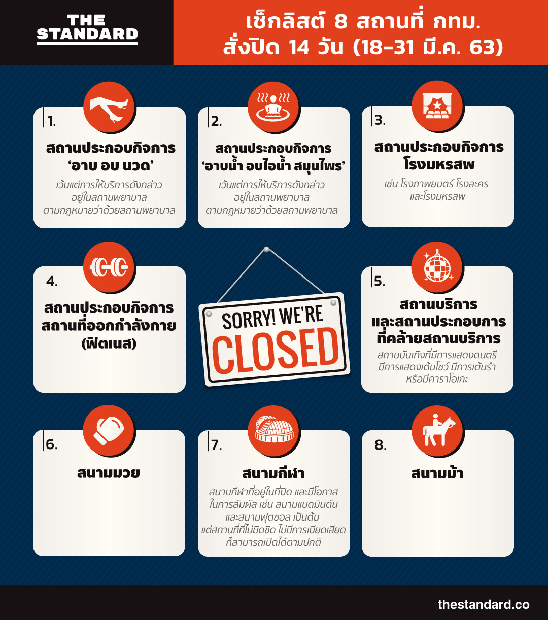 THE STANDARD หยิบยกข้อมูลจากงานแถลงข่าวศูนย์ข้อมูลโควิด-19 ประจำวันที่ 18 มีนาคม 2563 มาให้ดูกันชัดๆ ว่า 8 สถานที่ที่ กทม. สั่งปิดเป็นเวลา 14 วัน ประกอบด้วยสถานที่ประเภทใดบ้าง