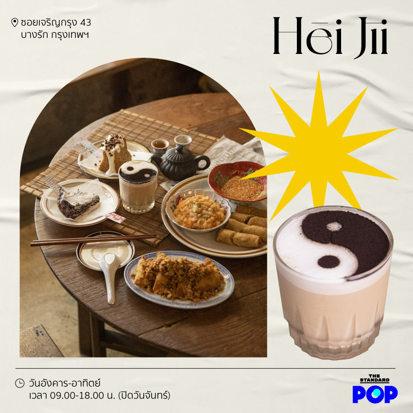 Hēi Jīi คาเฟ่เจริญกรุงบรรยากาศความเป็นจีนย้อนยุค เฟอร์นิเจอร์หรือของตกแต่งล้วนเป็นของในความทรงจำของเจ้าของร้าน ไม่ว่าจะเป็นข้าวของจากบ้านอาม่า หรือเก้าอี้ถั่งเต๊ที่พ่อกับแม่ใช้ยกน้ำชา ส่วนบริเวณผนังมีโปสเตอร์ที่ลูกค้าประจำทำเองและเอามาฝาก