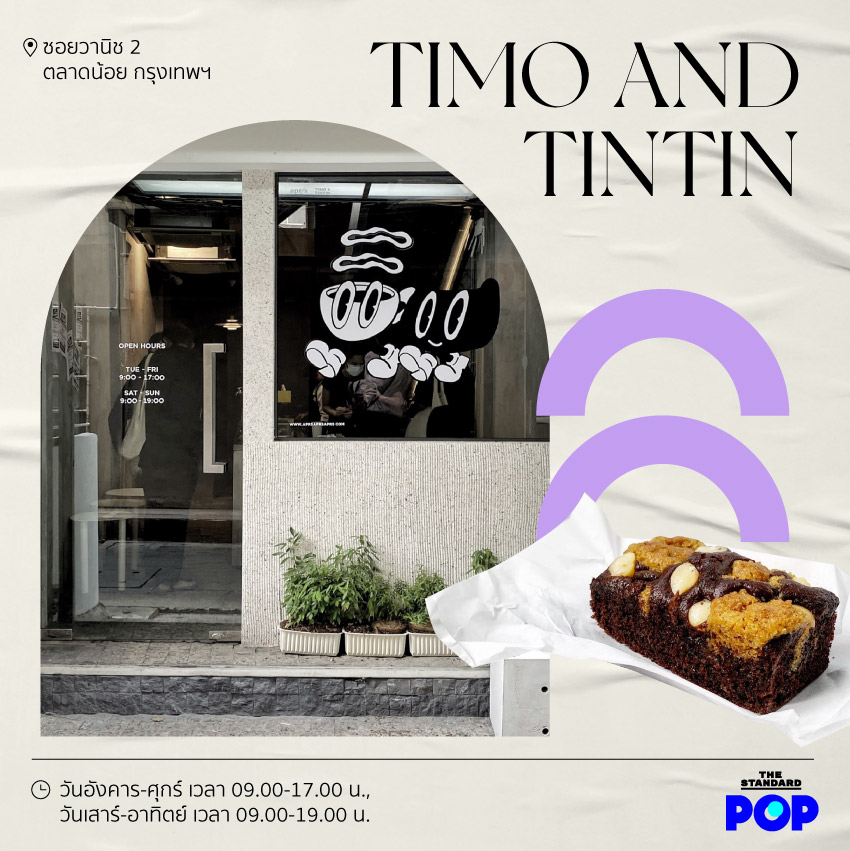 TIMO AND TINTIN คาเฟ่เปิดใหม่เจริญกรุงที่มีตัวการ์ตูนเป็นสัญลักษณ์ ข้างในตกแต่งอย่างเรียบง่ายสไตล์ลอฟต์ ร้านมีทั้งหมด 5 ชั้น และมีมุมแสดงงานศิลปะด้วย ชั้นดาดฟ้าสามารถขึ้นไปนั่งชมวิวย่านตลาดน้อยได้จากมุมสูง