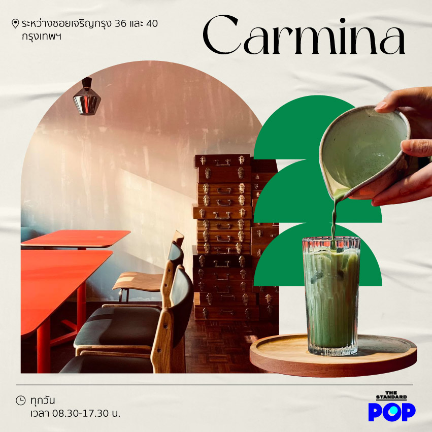 คาเฟ่เล็กๆ น่ารัก ที่ตกแต่งด้วยเฟอร์นิเจอร์และของสะสมย้อนยุค แล้วยังมีแคมเปญร่วมกับ Bangkok Design Week ด้วยการลด 30 บาทสำหรับเครื่องดื่มทุกเมนู และยังมีเมนูพิเศษที่ Carmina สร้างสรรค์ขึ้นเพื่องานนี้โดยเฉพาะ ชื่อเมนู Carmina’s Lychee