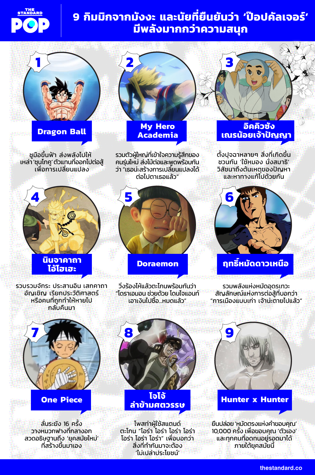 THE STANDARD POP เฝ้ามองปรากฏการณ์เหล่านี้อย่างสนอกสนใจ เลยลองรวบรวม 9 กิมมิกจากมังงะยอดนิยม เพื่อยืนยันความเชื่อที่ว่า ‘มังงะ’ คืออีกหนึ่งป๊อปคัลเจอร์ที่ถ้ามองให้ลึกไปกว่าความสนุก เราจะเห็น ‘ประเด็น’ ที่ซ่อนนัยให้ตีความได้ไม่รู้จบ และไม่แน่ว่าสิ่งเหล่านั้นอาจมีพลังมากกว่าที่คิด