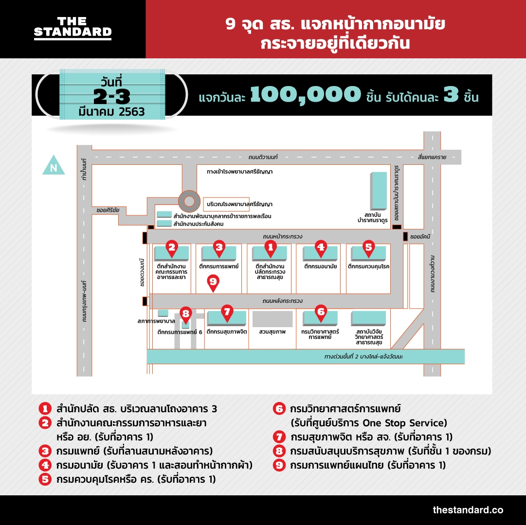 วันนี้ (2 มีนาคม) กระทรวงสาธารณสุข แจกหน้ากากอนามัยฟรีแก่ประชาชนทั่วไป จำนวน 100,000 ชิ้น ใน 9 กรมสังกัดกระทรวงสาธารณสุข โดยจะมีการแจกหน้ากากอนามัยให้คนละ 3 ชิ้น เพื่อให้เก็บไว้ใช้เฉพาะคนที่มีการเจ็บป่วยเท่านั้น หากไม่ป่วยให้เก็บไว้ หรือใช้หน้ากากอนามัยแบบผ้าไปก่อนเป็นหลัก โดยการแจกหน้ากากอนามัยจะมีไปจนถึงวันที่ 3 มีนาคมนี้ วันละ 100,000 ชิ้น