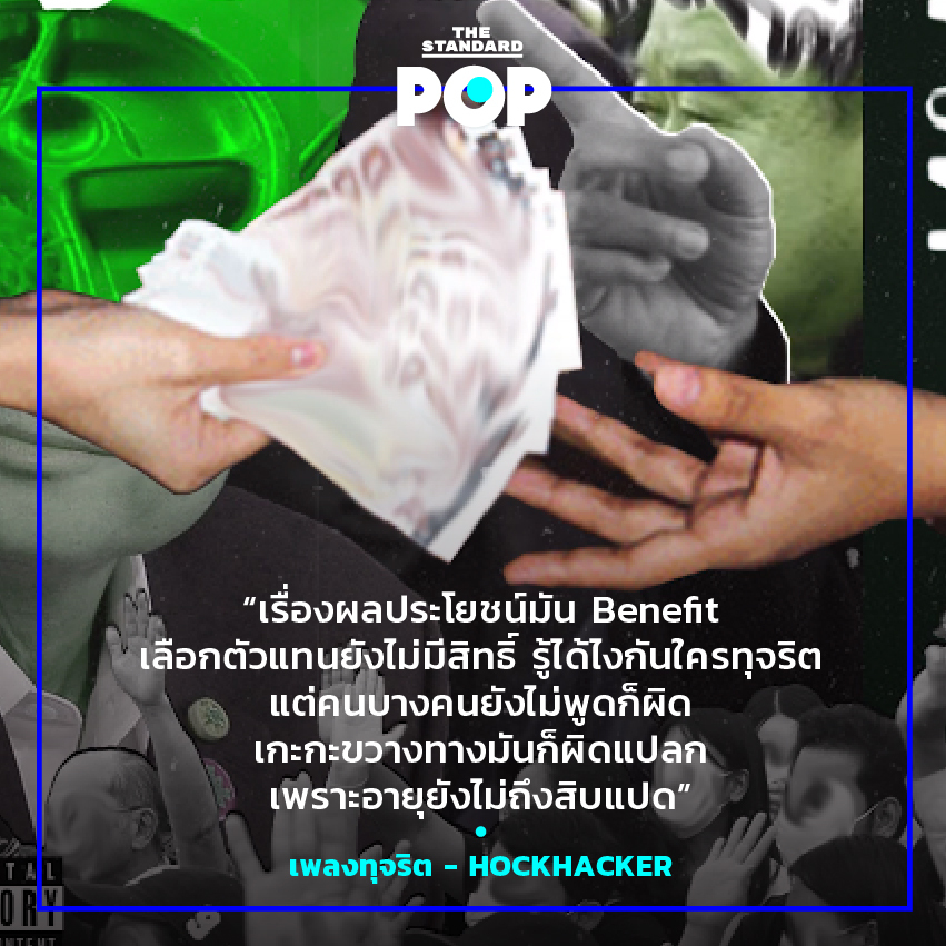 “เรื่องผลประโยชน์มัน Benefit เลือกตัวแทนยังไม่มีสิทธิ์ รู้ได้ไงกันใครทุจริต แต่คนบางคนยังไม่พูดก็ผิด เกะกะขวางทางมันก็ผิดแปลก เพราะอายุยังไม่ถึงสิบแปด”