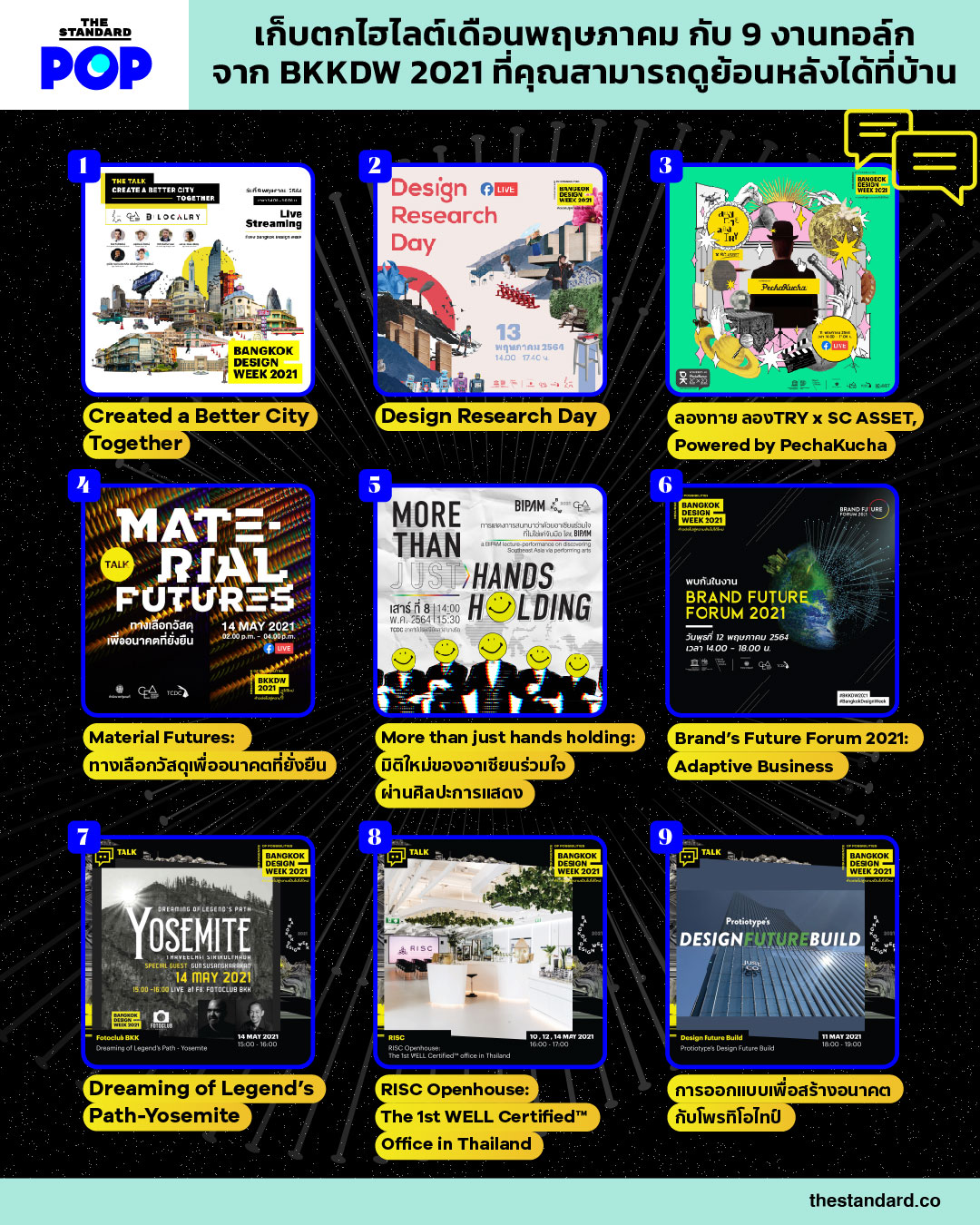 ซึ่งต่อให้ยังจัดงานจริง แต่ทางผู้จัดก็ได้เตรียมงานตามสถานการณ์ โดยการปรับเปลี่ยนรูปแบบภายใต้มาตรการการเฝ้าระวัง โดยในเดือนพฤษภาคมกิจกรรมทั้งหมดจะเกิดขึ้นในรูปแบบออนไลน์ ส่วนกิจกรรมประเภท On Ground ตามย่านต่างๆ นั้นถูกวางไว้ในเดือนมิถุนายนถึงกรกฎาคม และอาจมีการเปลี่ยนแปลงได้ตามสถานการณ์ ซึ่งทางผู้จัดจะอัปเดตให้ทราบผ่านช่องทางหลัก www.facebook.com/BangkokDesignWeek