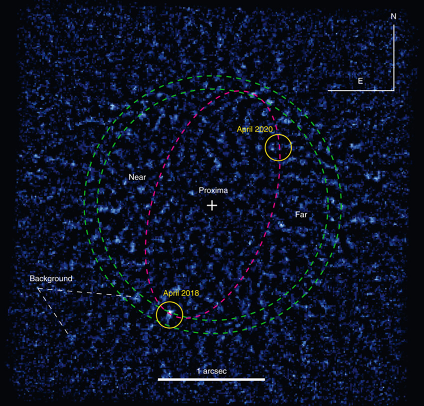 ภาพจากอุปกรณ์ SPHERE ที่หอดูดาว Very Large Telescope (VLT) ในประเทศชิลี ที่แสดงให้เห็นดาวเคราะห์ Proxima Centauri c โคจรตามเส้นสีแดงรอบวงกลมดำตรงกลาง ซึ่งเป็นตำแหน่งของดาวแม่หรือดาว Proxima Centauri ที่ทำหน้าที่เป็นดาวฤกษ์ศูนย์กลางระบบ