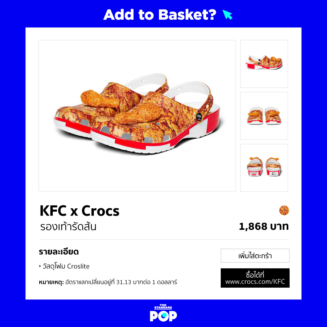 คุณไม่ได้ตาลายเพราะหิวเกินไปหรอก เพราะ Add To Basket? วันนี้เป็นรองเท้าคอลเล็กชันพิเศษอย่าง KFC x Crocs ที่รวมเอาความคลาสสิกของทั้งสองแบรนด์มารวมกัน ทั้งรองเท้า Crocs รัดส้นเจาะรู กับไก่ทอดสูตรเฉพาะของผู้พันแซนเดอร์ส