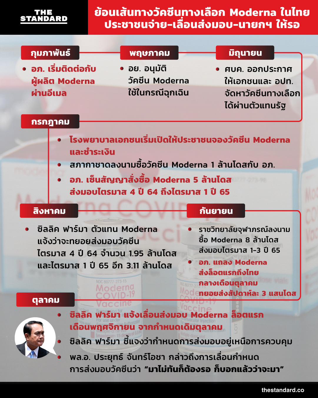 THE STANDARD ย้อนเส้นทางวัคซีนทางเลือก Moderna ในไทย ที่ประชาชนต้องเสียเงินจองกับโรงพยาบาลเอกชนด้วยตนเอง และใช้ระยะเวลารอคอยกว่า 3 เดือน กระทั่งถูกเลื่อนส่งมอบ และนายกรัฐมนตรีบอกให้รอ
