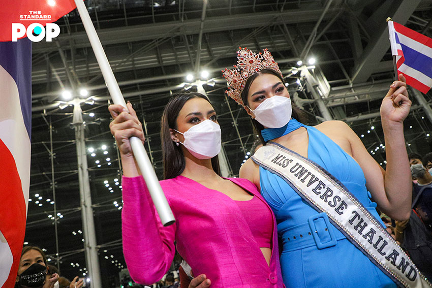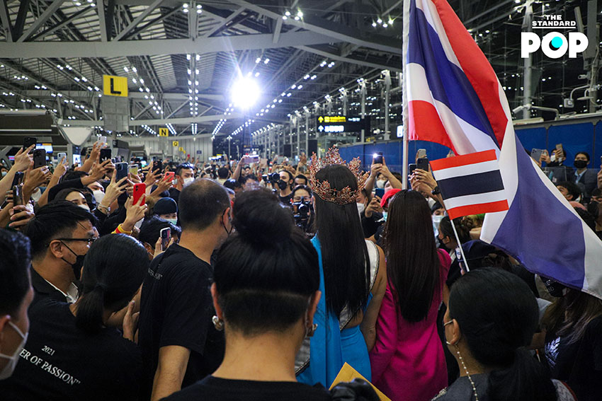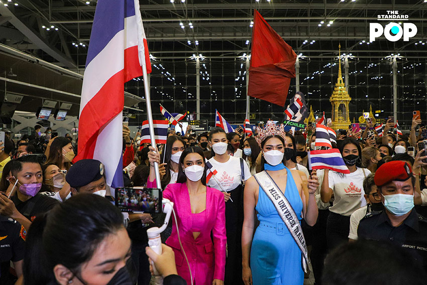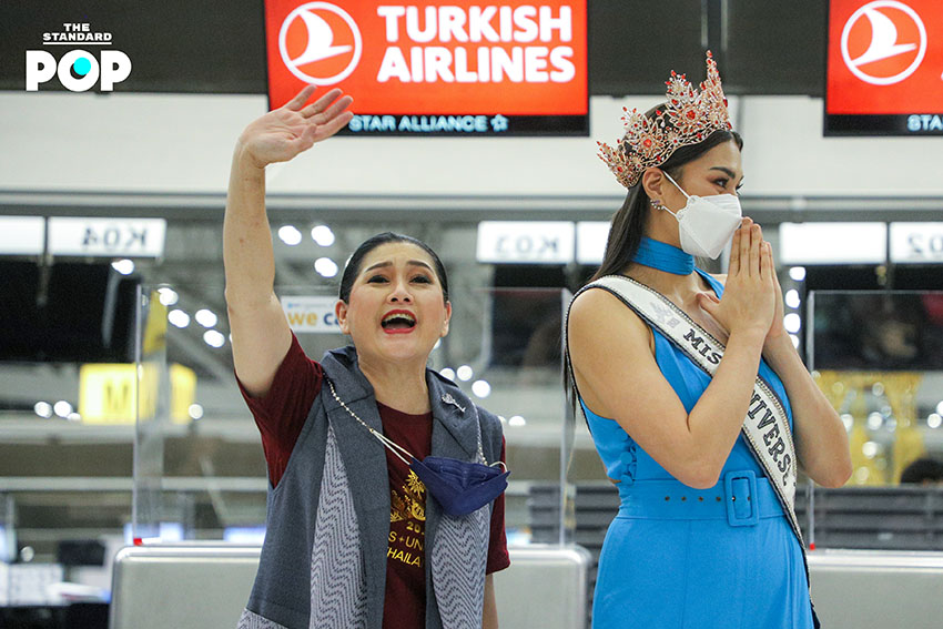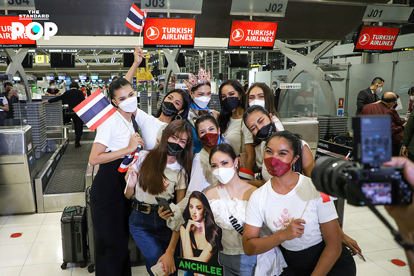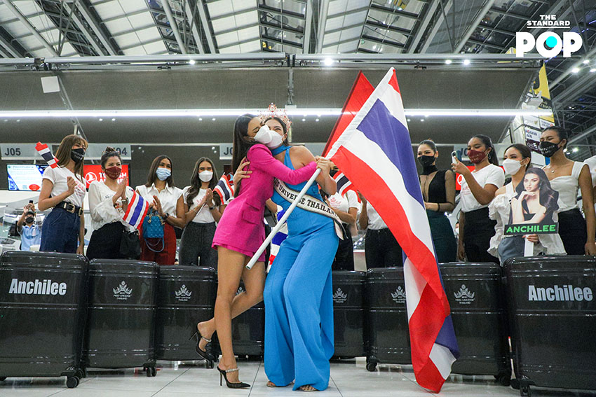 ก่อนเริ่มต้นเดินทางสู่เส้นทางแห่งจักรวาล ‘แอนชิลี’ ได้ปรากฏกายเพื่อพบปะพูดคุยกับแฟนคลับและสื่อมวลชนภายในสนามบินสุวรรณภูมิด้วยชุดจั๊มสูทสีฟ้าจากห้องเสื้อ NARONG ซึ่งเป็นชุดเดียวกันกับรอบออดิชันที่เธอได้ตอบคีย์เวิร์ด ‘สติ’ ได้อย่างน่าประทับใจจนได้รับ Golden Tiara พร้อมกระเป๋าเดินทางจำนวน 9 ใบ ด้วยความมุ่งมั่นและตั้งใจเกินร้อยในการประกวด Miss Universe 2021 โดยตั้งเป้าคว้าชัยชนะและมงสามเพื่อแฟนนางงามชาวไทย ซึ่งไฮไลต์ของวันนี้คือการส่งต่อธงไทยจากพี่สู่น้อง ‘อแมนด้า’ ถึง ‘แอนชิลี’ โบกสะบัดเป็นสัญญาณการเริ่มต้นของการประกวดในครั้งนี้ พร้อมส่งพลังบวกในด้านดีและกำลังใจที่ไม่มีสิ้นสุดให้กับตัวแทนสายสะพาย THAILAND อย่าง ‘แอนชิลี’