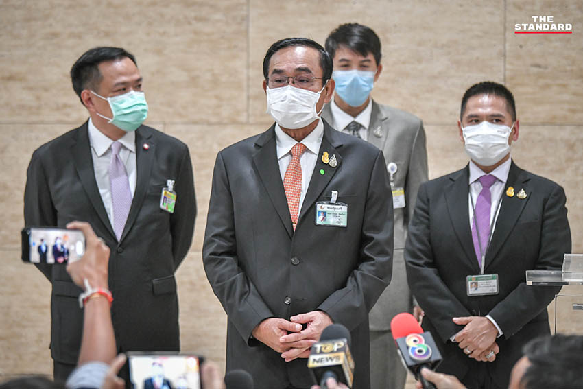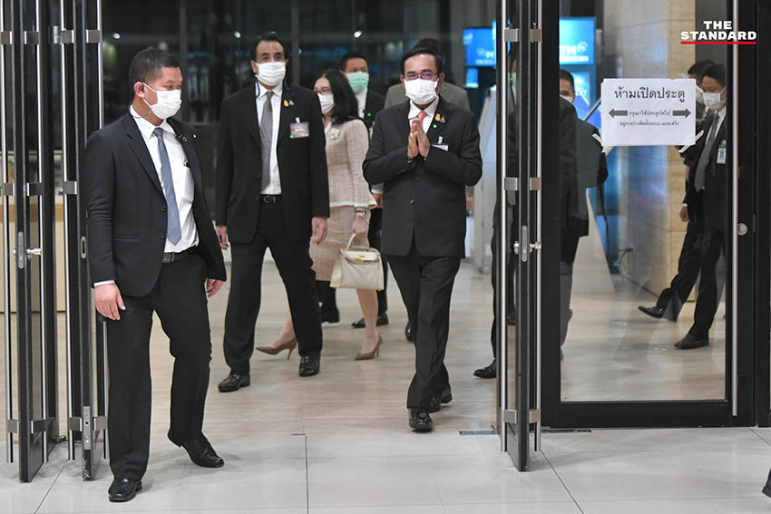 วันนี้ (3 มิถุนายน) ภายหลังเสร็จสิ้นการลงมติรับหลักการร่างพระราชบัญญัติงบประมาณรายจ่ายประจำปีงบประมาณ 2565 พล.อ. ประยุทธ์ จันทร์โอชา นายกรัฐมนตรี และรัฐมนตรีว่าการกระทรวงกลาโหม ได้เดินลงมาจากห้องประชุม พร้อมด้วย อนุทิน ชาญวีรกูล รองนายกรัฐมนตรี และรัฐมนตรีว่าการกระทรวงสาธารณสุข วราวุธ ศิลปอาชา รัฐมนตรีว่าการกระทรวงทรัพยากรธรรมชาติและสิ่งแวดล้อม และ อธิรัฐ รัตนเศรษฐ รัฐมนตรีช่วยว่าการกระทรวงคมนาคม
