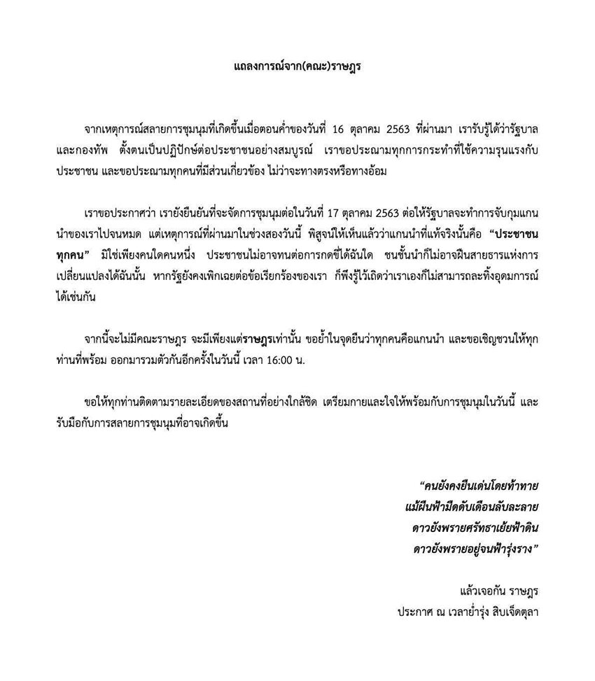 เราขอประกาศว่า เรายังยืนยันที่จะจัดการชุมนุมต่อไปในวันที่ 17 ตุลาคม 2563 ต่อให้รัฐบาลจะจับกุมแกนนำของเราไปจนหมด แต่เหตุการณ์ที่ผ่านมาในช่วงสองวันนี้พิสูจน์ให้เห็นแล้วว่า แกนนำที่แท้จริงนั้นคือ ‘ประชาชนทุกคน’ มิใช่เพียงคนใดคนหนึ่ง ประชาชนไม่อาจทนต่อการกดขี่ได้ฉันใด ชนชั้นนำก็ไม่อาจฝืนสายธารแห่งการเปลี่ยนแปลงได้ฉันนั้น หากรัฐยังคงเพิกเฉยต่อข้อเรียกร้องของเรา ก็พึงรู้ไว้เถิดว่า เราเองก็ไม่สามารถละทิ้งอุดมการณ์ได้เช่นกัน