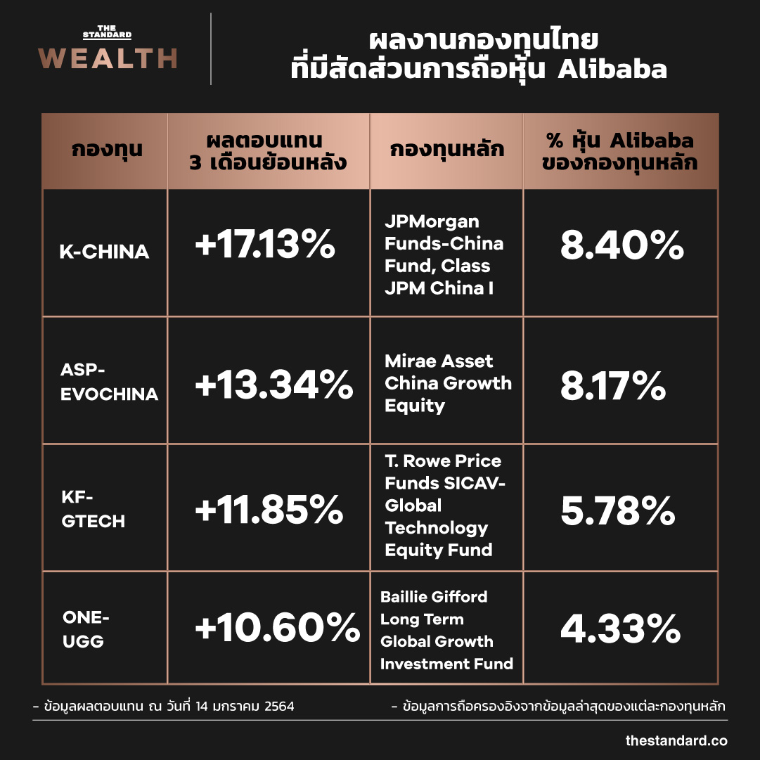 ขณะเดียวกันก็มีกองทุนไทยซึ่งส่วนมากเป็นการนำเงินไปลงทุนในกองทุนต่างประเทศ และกองทุนเหล่านั้นถือครองหุ้น Alibaba อยู่เป็นสัดส่วนหลักของพอร์ตลงทุน อาทิ กองทุนเปิดวรรณ อัลติเมท โกลบอล โกรว์ธ (ONE-UGG) ซึ่งลงทุนใน Baillie Gifford Long Term Global Growth Investment Fund ซึ่ง ณ สิ้นปี 2563 ถือหุ้น Alibaba อยู่ 4.33%