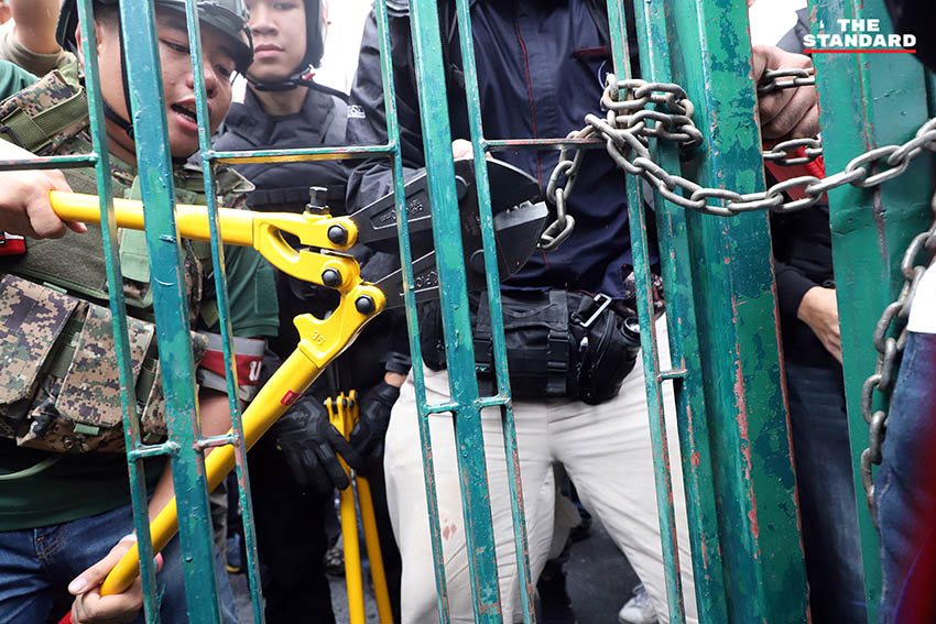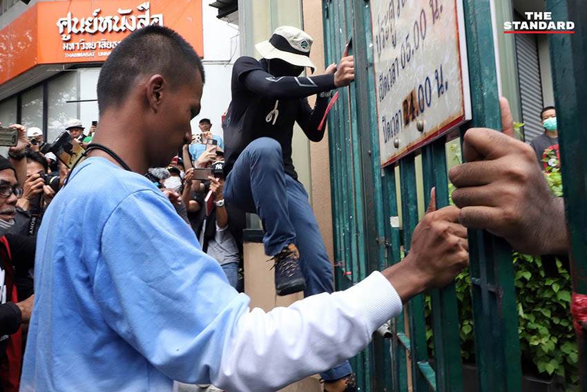 เมื่อเวลา 13.41 น. ที่ผ่านมา ผู้ชุมนุมที่อยู่ด้านในของมหาวิทยาลัยธรรมศาสตร์ใช้เครื่องมือตัดโซ่คล้องกุญแจประตูมหาวิทยาลัยฝั่งท่าพระจันทร์ เพื่อเปิดทางให้มวลชนที่เดินทางมาจากท่าเรือสามารถเดินทางเข้าพื้นที่มหาวิทยาลัยเพื่อร่วมการชุมนุมได้ และหลังจากนั้น เพนกวิน-พริษฐ์ ชิวารักษ์ หนึ่งในแกนนำได้เดินนำมวลชนที่ระบุว่าเป็นชาวนนทบุรีเข้ามาร่วมชุมนุมในพื้นที่ผ่านทางประตูดังกล่าวที่เพิ่งตัดโซ่ที่คล้องอยู่ออกได้