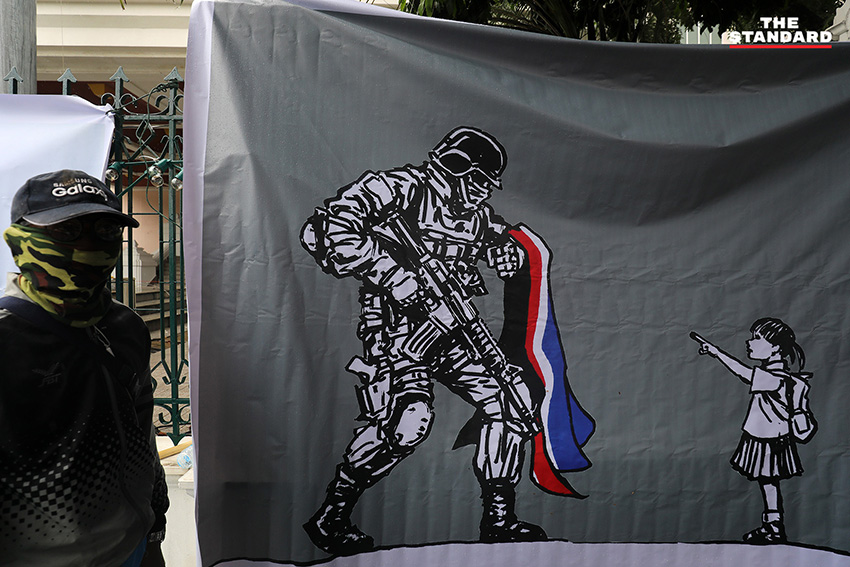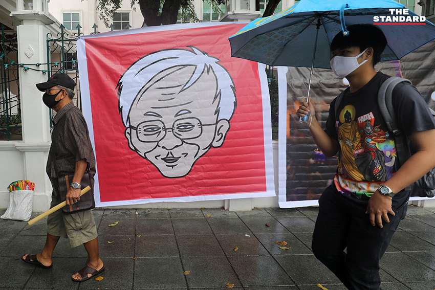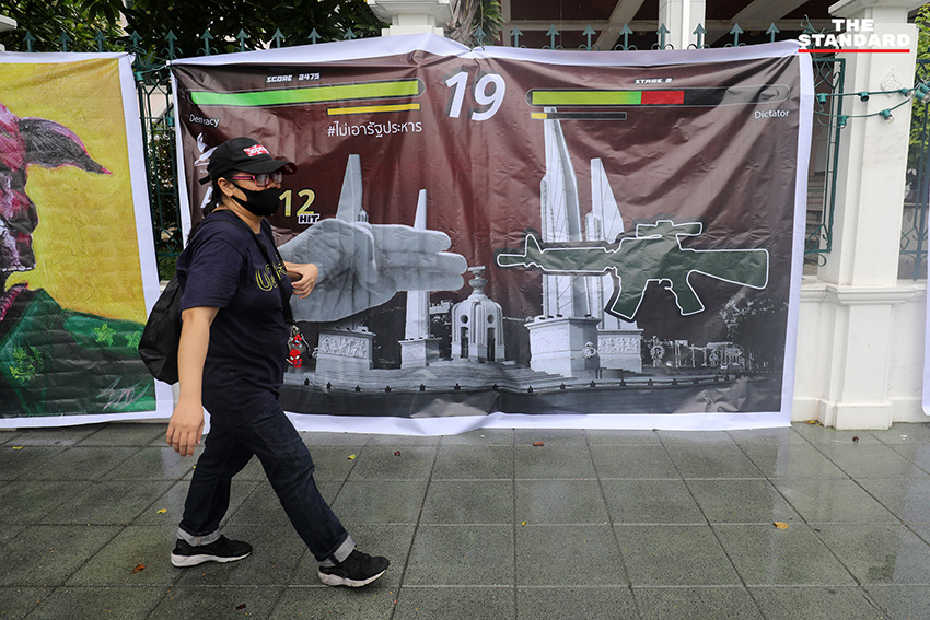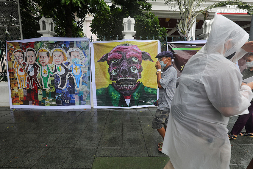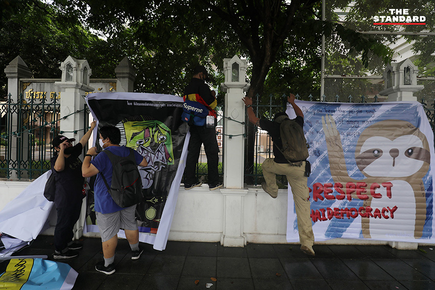 เมื่อเวลา 09.30 น. มวลชนเริ่มทยอยติดไวนิลภาพล้อการเมืองที่เตรียมไว้ประมาณ 40 ชิ้นตามรั้วมหาวิทยาลัยธรรมศาสตร์ ท่าพระจันทร์ ฝั่งประตูตรงข้ามสนามหลวง โดยเป็นภาพที่ศิลปินกลุ่มต่างๆ ส่งมาให้เพื่อใช้ในงานวันนี้