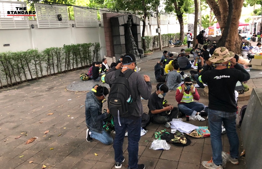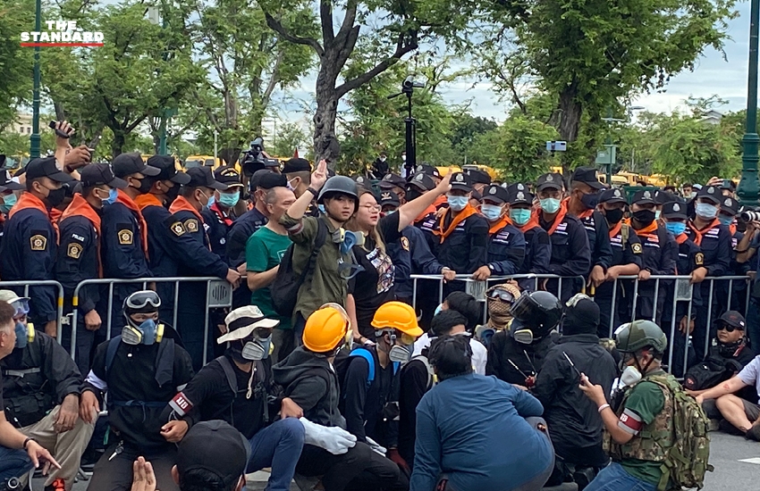 08.26 น. กลุ่มผู้ชุมนุมตั้งแนวกำลังการ์ด ขณะเดินประชิดแนวตำรวจบริเวณหน้าศาลฎีกา