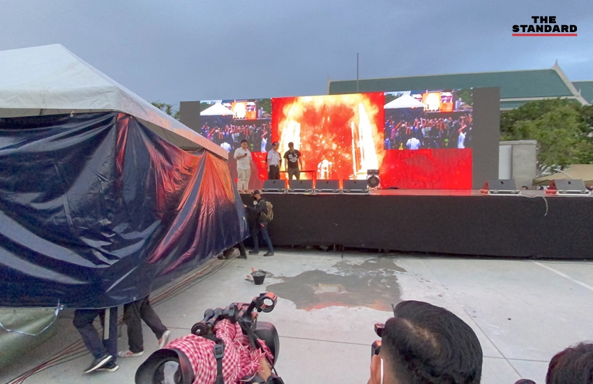 06.09 น. มวลชนเริ่มกลับมานั่งหน้าเวทีปราศรัย หลังจากที่ปักหลักค้างคืนรอการนัดหมายในช่วงเวลา 06.00 น. มีการนำเต้นท์พร้อมผ้าใบสีดำมาตั้งหน้าเวที โดยคาดว่าเป็นการเจาะพื้นเพื่อนำหมุดคณะราษฎรหมุดที่สองมาติดตั้งที่นี่