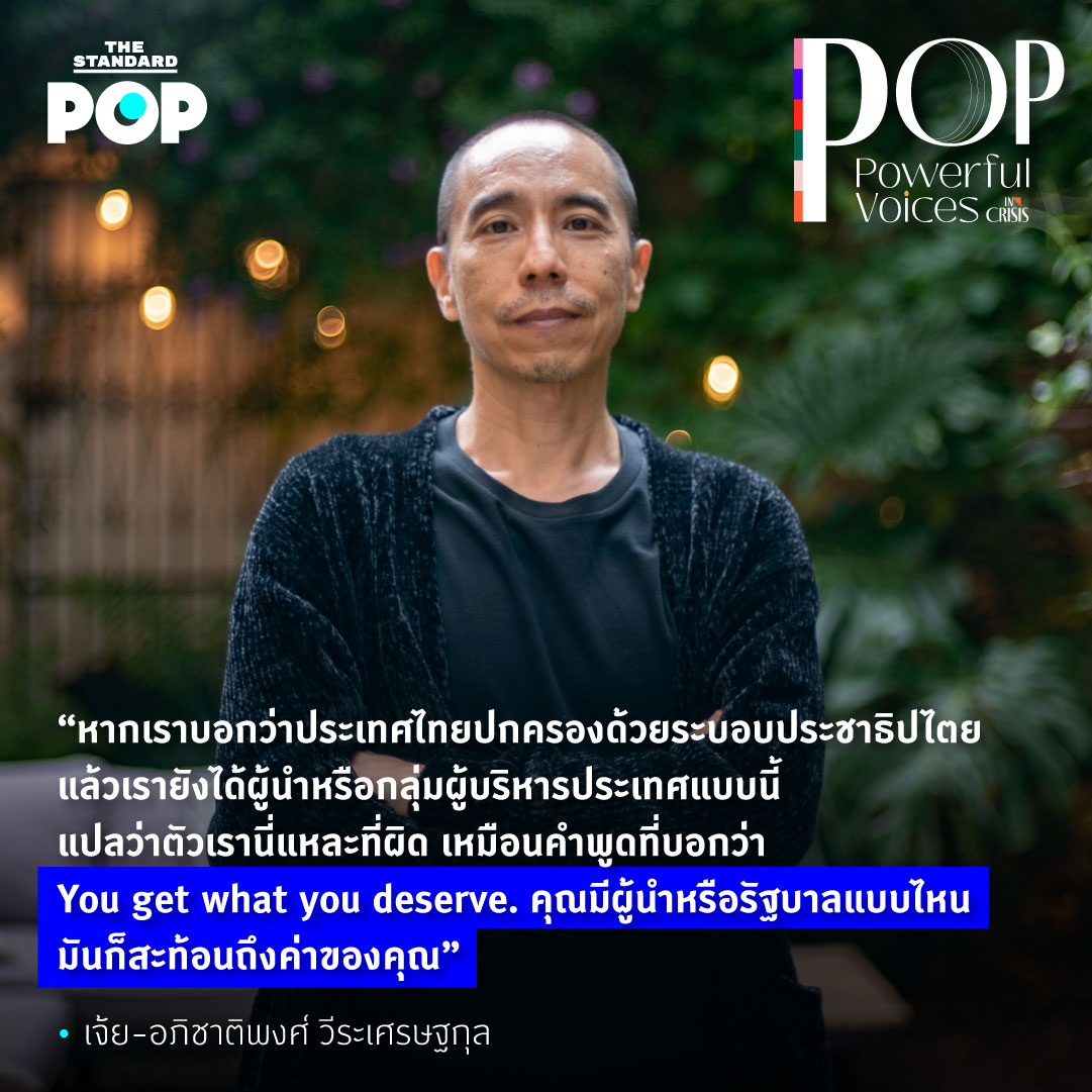 “หากเราบอกว่าประเทศไทยปกครองด้วยระบอบประชาธิปไตย แล้วเรายังได้ผู้นำหรือกลุ่มผู้บริหารประเทศแบบนี้ แปลว่าตัวเรานี่แหละที่ผิด เหมือนคำพูดที่บอกว่า “You get what you deserve.” คุณมีผู้นำหรือรัฐบาลแบบไหน มันก็สะท้อนถึงค่าของคุณ”