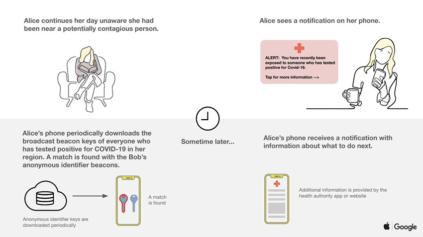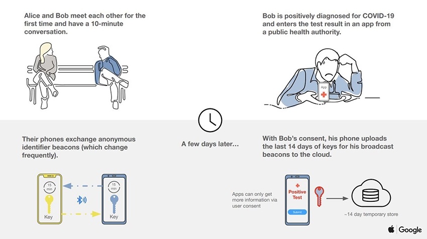 ตัวอย่างเช่น อลิซและบ๊อบเคยพบกันครั้งแรก และนั่งคุยกันเป็นระยะเวลา 10 นาที โดยที่ทั้งสองใช้สมาร์ทโฟนระบบปฏิบัติการ iOS และ Android ตามลำดับ ซึ่งสมาร์ทโฟนของทั้งคู่จะดำเนินการแลกเปลี่ยน ‘กุญแจ’ หรือเทคโนโลยีบีคอนแบบที่ไม่ระบุตัวตน
