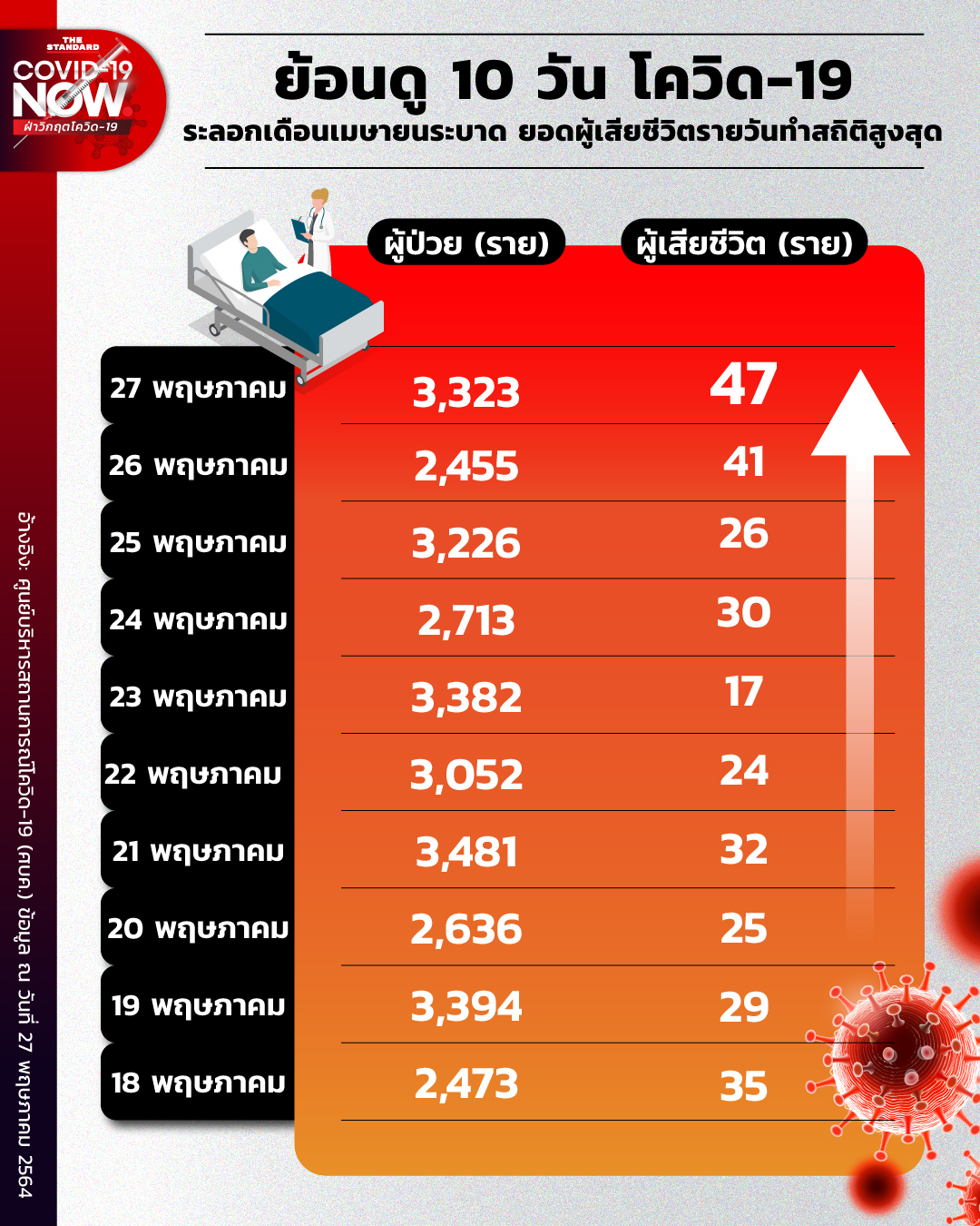 ยอดผู้เสียชีวิตโควิด-19 วันนี้ (27 พฤษภาคม) 47 ราย สร้างสถิติตัวเลขเสียชีวิตรายวันสูงที่สุดนับแต่มีการระบาดในไทย