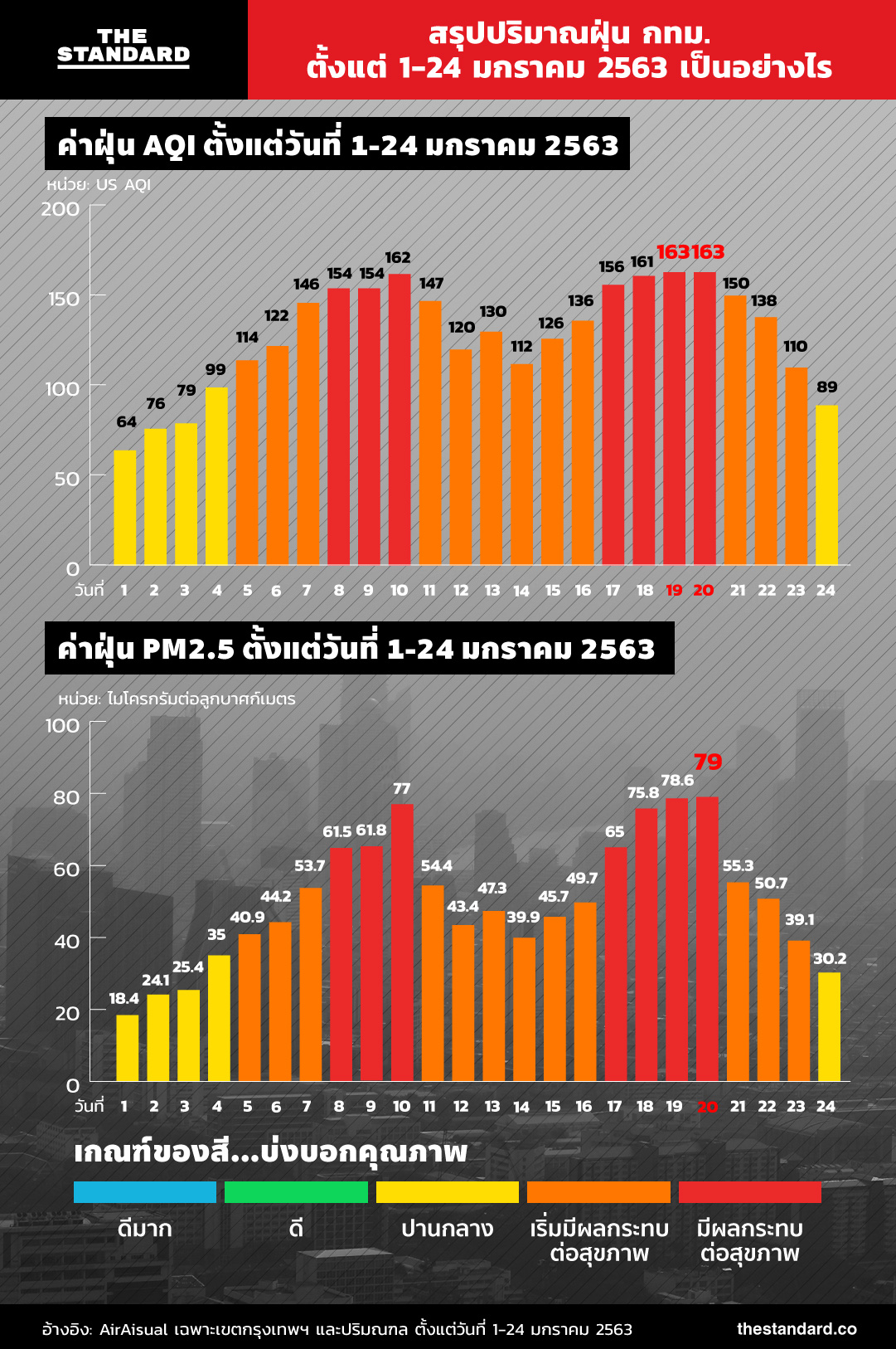 THE STANDARD ได้รวบรวมตัวเลขค่าฝุ่นแบบ AQI และ PM2.5 ในรอบ 24 วันมาดูกันว่าเป็นอย่างไรบ้าง