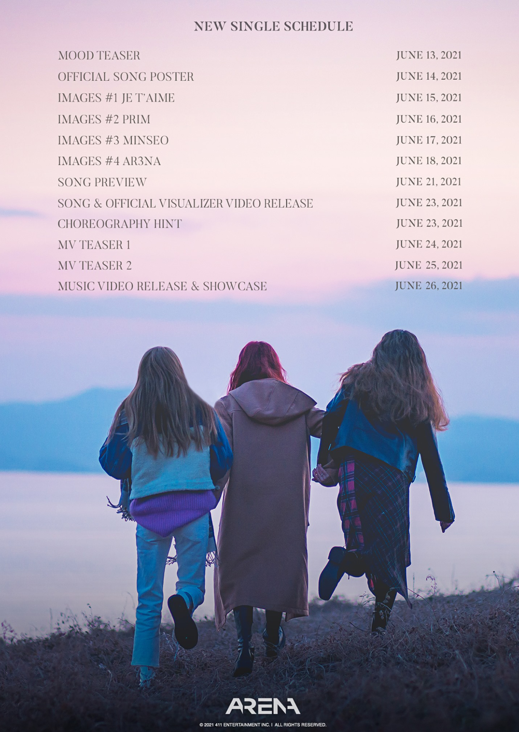 AR3NA เกิร์ลกรุ๊ปน้องใหม่จากค่าย 411 Music เผยโปสเตอร์ทีเซอร์ใหม่ พร้อมตารางการคัมแบ็กให้ชาว IRIS (ชื่อแฟนคลับของ AR3NA) ได้เตรียมความพร้อมก่อนไปชมมิวสิกวิดีโอซิงเกิลที่สองของพวกเธอพร้อมกัน 23 มิถุนายนนี้