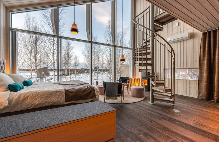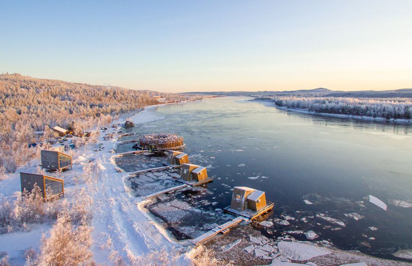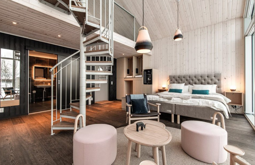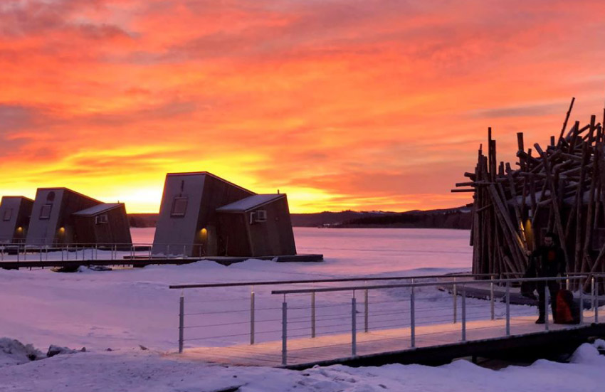 อาคารหลักมีลักษณะคล้ายรังนก ตรงกลางเป็นบ่ออาบน้ำเย็น ซึ่งเว้นช่วงหลังคาไว้ให้แสงแดดลอดผ่าน ทั้งหมดออกแบบโดยสองนักออกแบบ Bertil Harström เจ้าของผลงาน The UFO Tree Hotel และ Johan Kauppi นักออกแบบภายในที่มีชื่อเสียงในสวีเดน