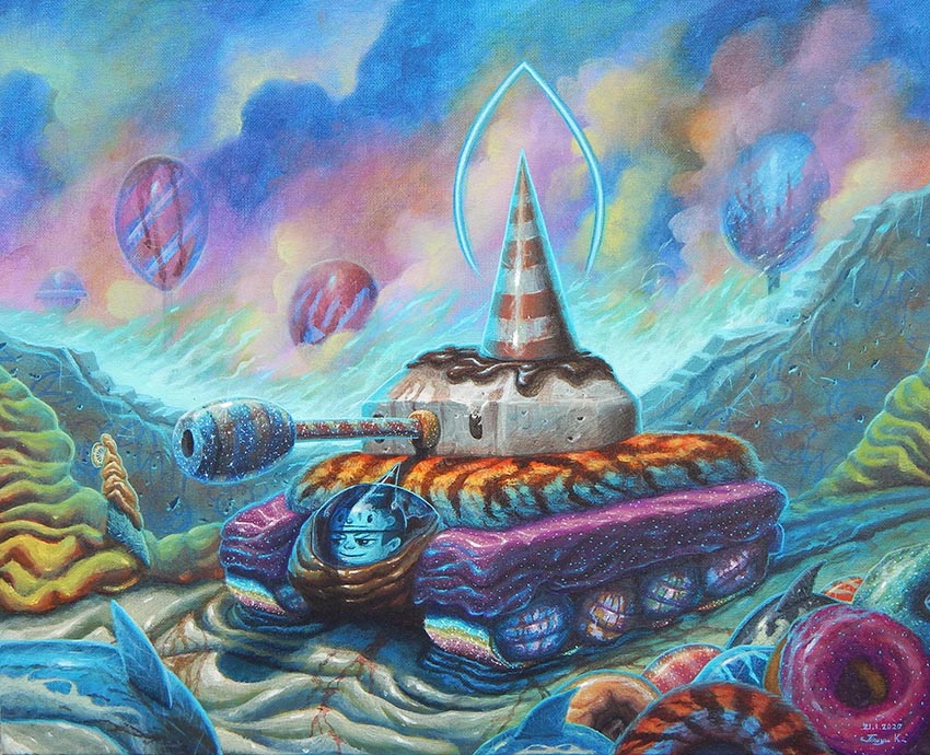 What: ทฤษฎีความโกลาหล กล่าวไว้ว่า ยิ่งเราพยายามเข้าไปจัดการเปลี่ยนแปลงให้เป็นไปตามที่หวังมากเท่าไร ยิ่งส่งผลให้เกิดความวุ่นวาย เพราะผลที่ตามมานั้นอาจเปลี่ยนแปลงไปมากกว่าเดิม เปรียบเสมือนการกระทำของมนุษย์ที่ยิ่งเข้าไปรบกวนธรรมชาติหรือสิ่งแวดล้อมมากเท่าไร ไม่ทางตรงก็ทางอ้อมกลับส่งผลกระทบต่อโลกมากขึ้นเท่านั้น นี่คือผลงานที่ว่าด้วยความโกลาหลของศิลปิน จิรายุ เกียรติรุ่งวิไลกุล ที่สะท้อนการกระทำเหล่านั้นให้เป็นดั่งดินแดนขนมหวาน แม้ภายนอกจะดูหอมหวานเพียงใด แต่ภายในกลับตรงกันข้าม นำเสนอผ่านศิลปะสไตล์ป๊อป เซอร์เรียลลิสม์ ด้วยความน่ารักของตัวการ์ตูนในดินแดนขนมหวาน แต่แอบแฝงความชั่วร้ายบางอย่างไว้