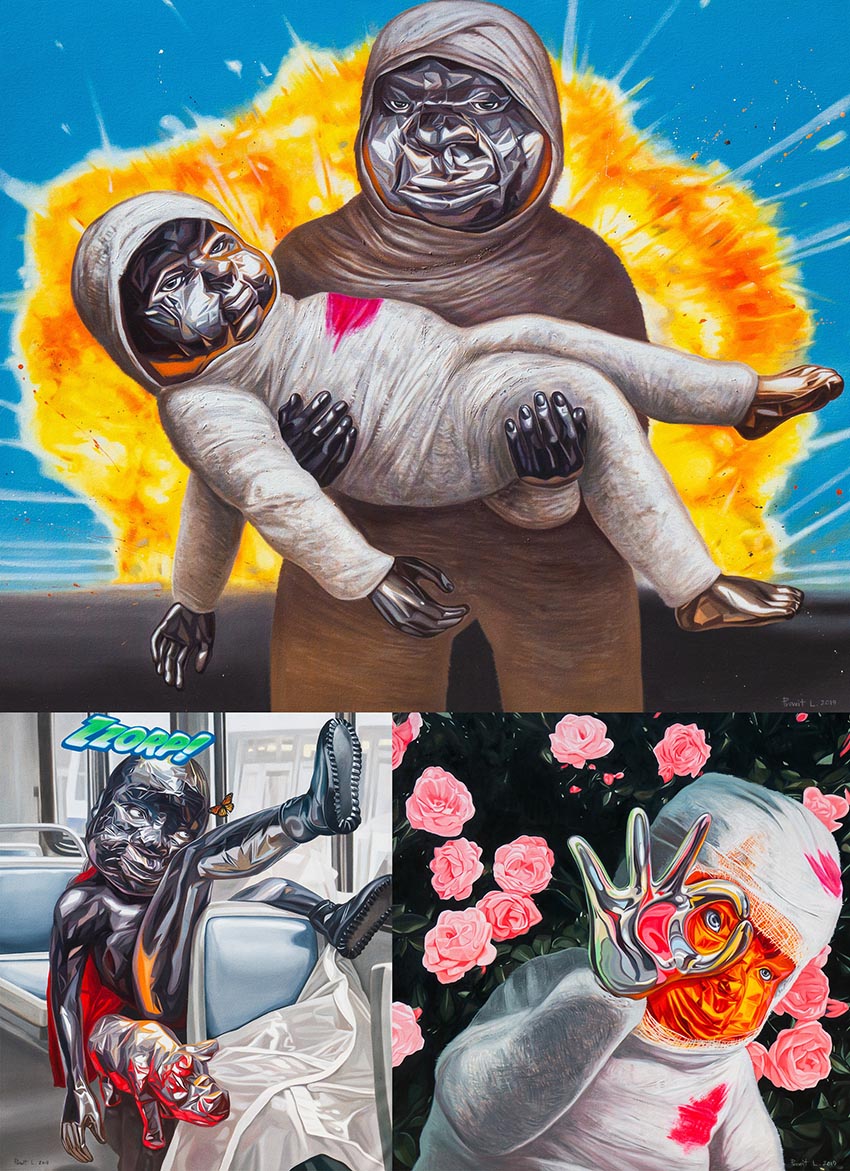 การที่เลือกใช้ภาพเด็กที่มีรอยยิ้มนั้นดูช่างย้อนแย้งกันในสถานการณ์ต่างๆ ที่ดูแล้วไม่น่าจะมีความสุขจริงๆ เท่าไร ความโดดเด่นของงานนี้คือการที่ศิลปินเลือกใช้โทนสีสังเคราะห์ และเทคนิคการวาด แทนที่ผิวเนื้อหนังด้วยอะลูมิเนียม ฟอยล์ โลหะ ให้ความรู้สึกมันวาว รวมถึงรอยยับต่างๆ ซึ่งเป็นเอกลักษณ์เฉพาะตัวของศิลปิน