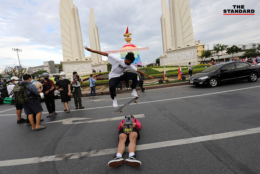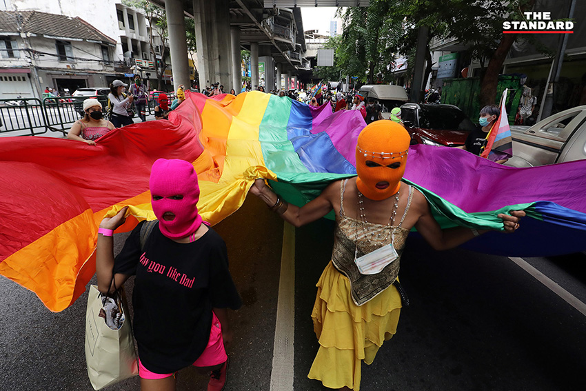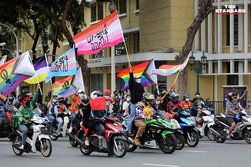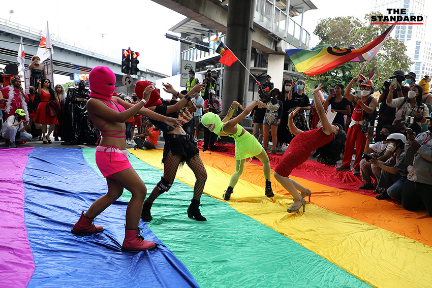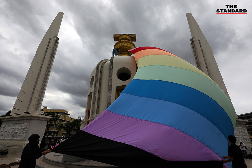 เวลา 16.00 น. กลุ่มผู้ชุมนุมเคลื่อนขบวนมาถึงที่อนุสาวรีย์ประชาธิปไตย ได้เริ่มทำกิจกรรมนำผ้าสีรุ้งมาคลุมพานอนุสาวรีย์ประชาธิปไตย เพื่อแสดงออกเชิงสัญลักษณ์ในการเรียกร้องประชาธิปไตยและความหลากหลายทางเพศ โดยมีการใช้พื้นที่ช่องการจราจรในสุดของอนุสาวรีย์ประชาธิปไตย 1 ช่องการจราจร