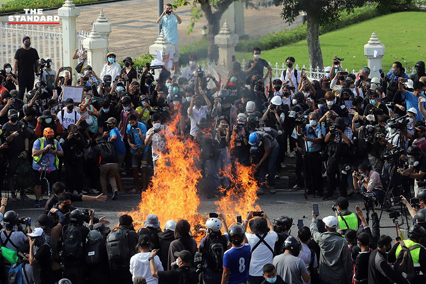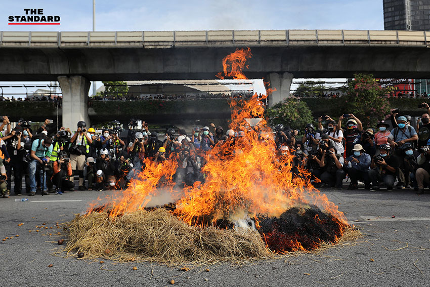 มวลชนทะลุฟ้า เคลื่อนขบวนมาถึงบริเวณสามเหลี่ยมดินแดง ฝั่งมุ่งหน้าถนนวิภาวดีที่เจ้าหน้าที่นำตู้คอนเทนเนอร์มาวางเป็นจุดสกัดไม่ให้ขบวนเคลื่อนผ่านไปได้ ขณะที่มวลชนบางส่วนพยายามรื้อถอนตู้คอนเทนเนอร์ดังกล่าวเพื่อเปิดทางและเคลื่อนขบวนต่อ