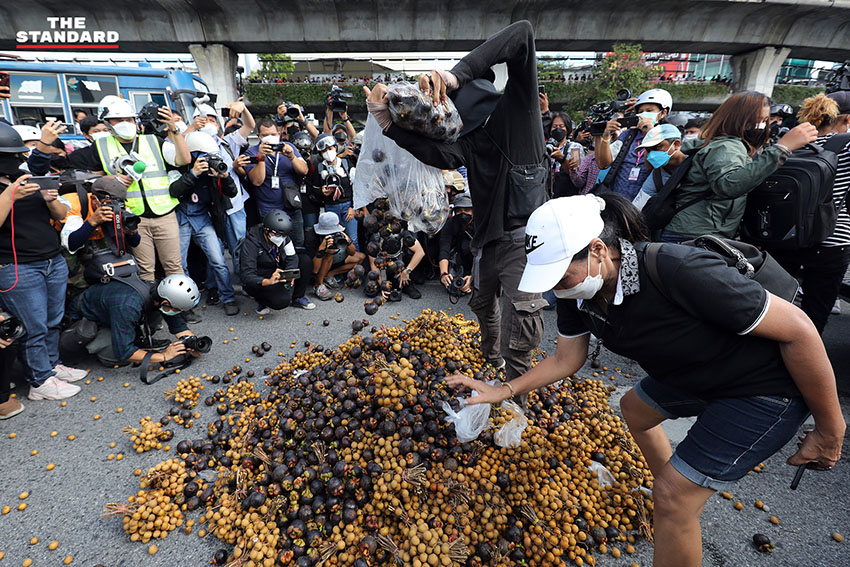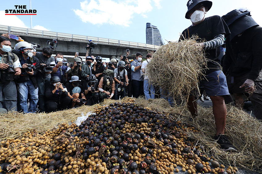 มวลชนกลุ่มทะลุฟ้าเทลำไยและมังคุด เพื่อแสดงออกเชิงสัญลักษณ์ต่อการบริหารที่ผิดพลาดล้มเหลวของรัฐบาลที่ทำสินค้าเกษตรราคาตกต่ำ ที่ถนนหน้าอนุสาวรีย์ชัยสมรภูมิ