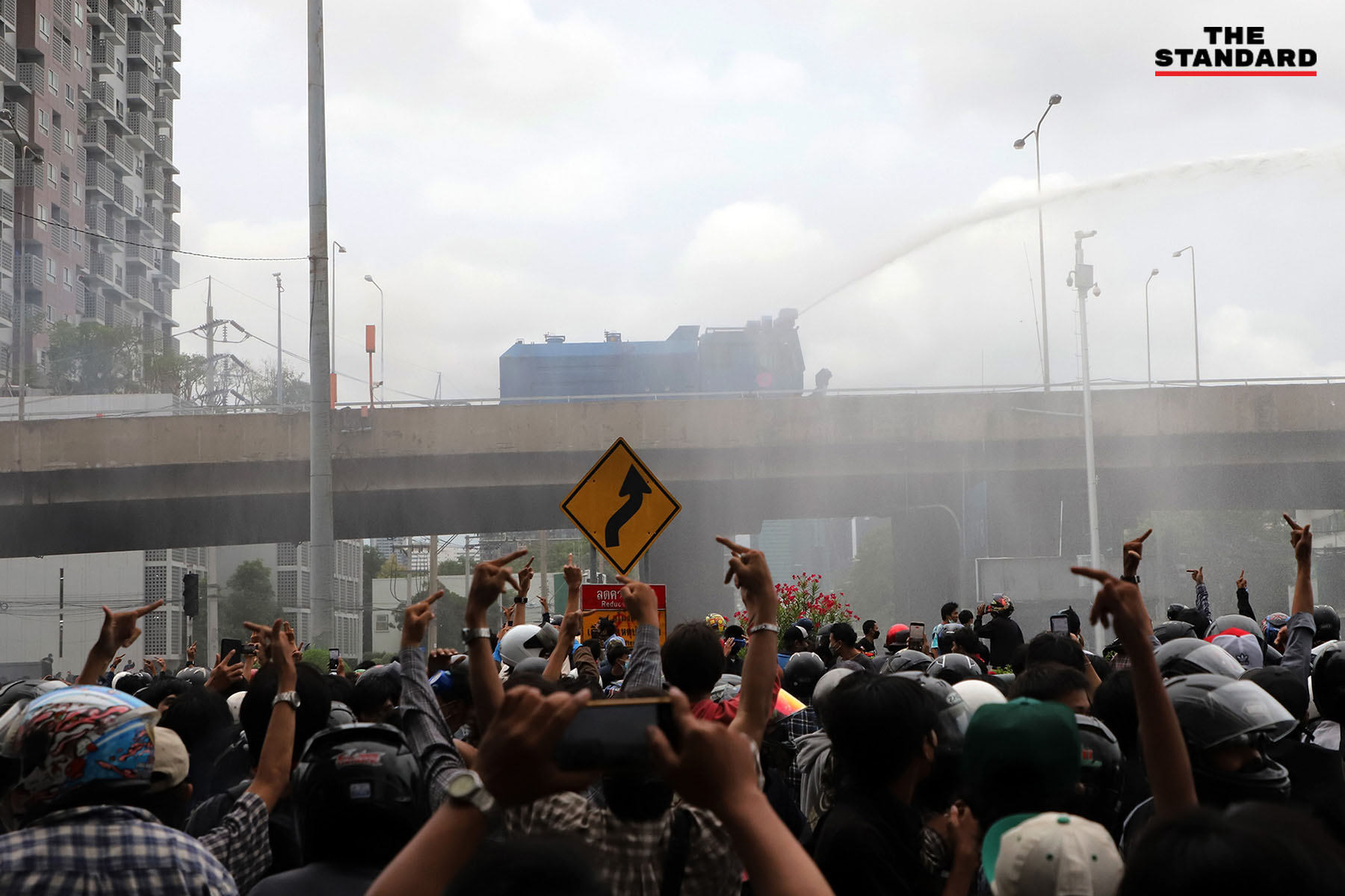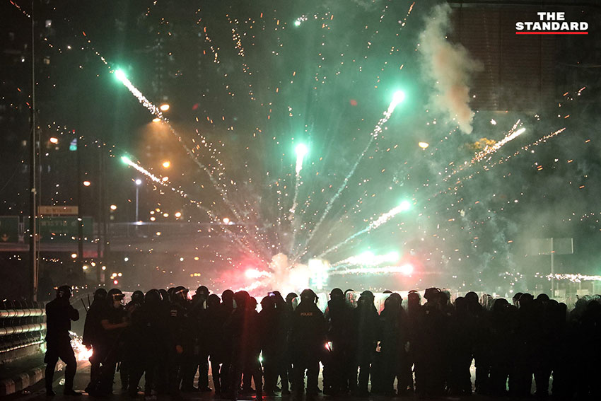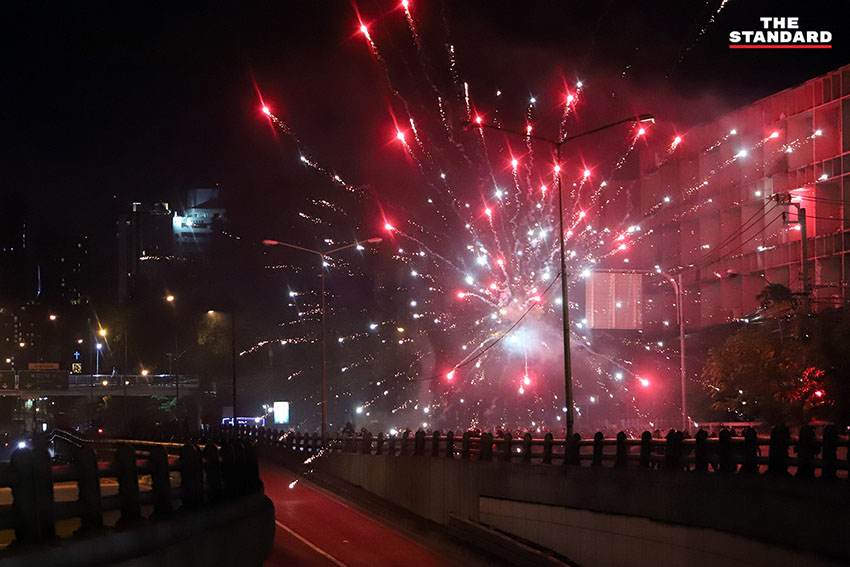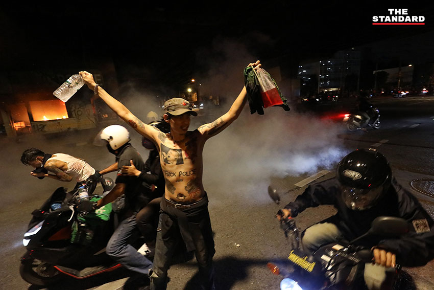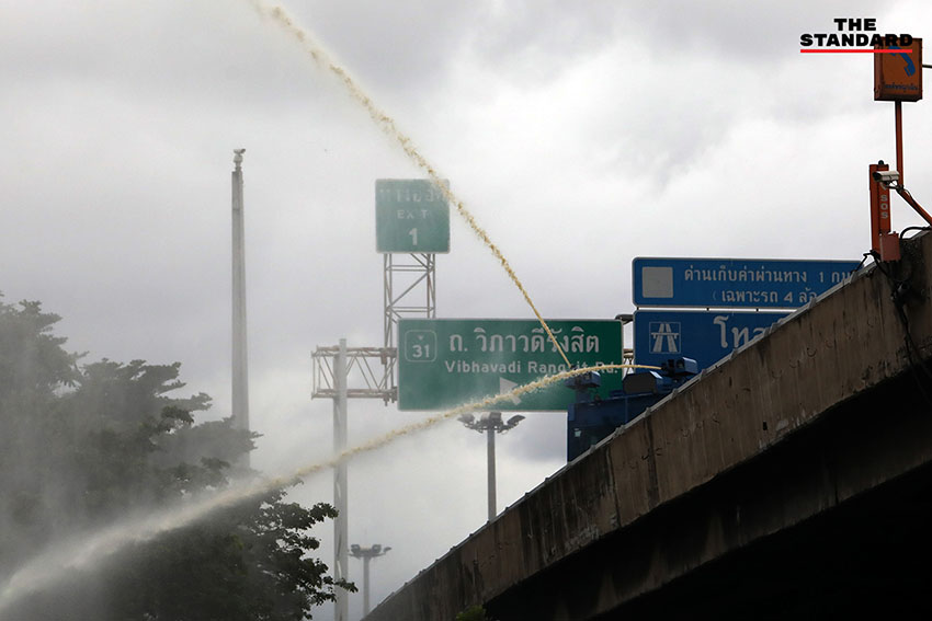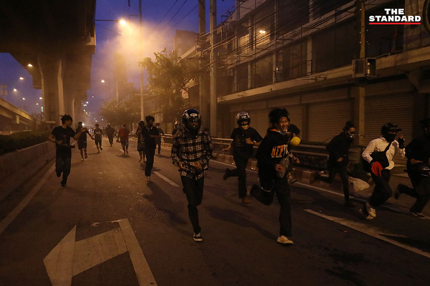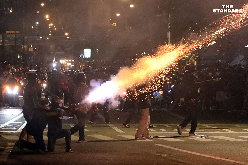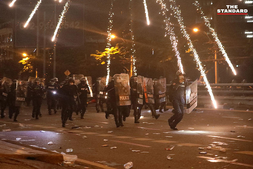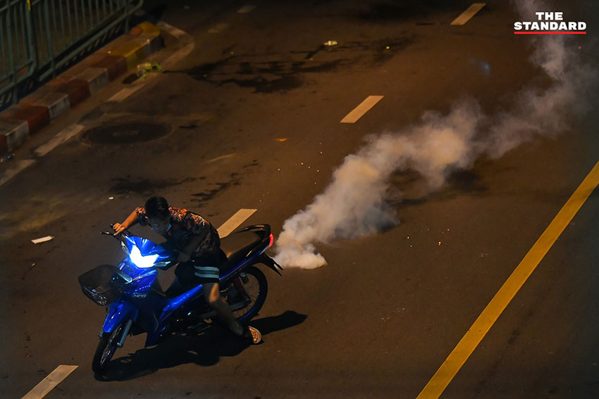 เวลา 19.24 น. ตำรวจควบคุมฝูงชน (คฝ.) ขึ้นไปบนทางด่วนดินแดง มีการใช้แก๊สน้ำตา ผู้ชุมนุมล่าถอยไปทางอนุสาวรีย์ชัยสมรภูมิ มีการจุดพลุจากฝั่งผู้ชุมนุมอย่างต่อเนื่อง