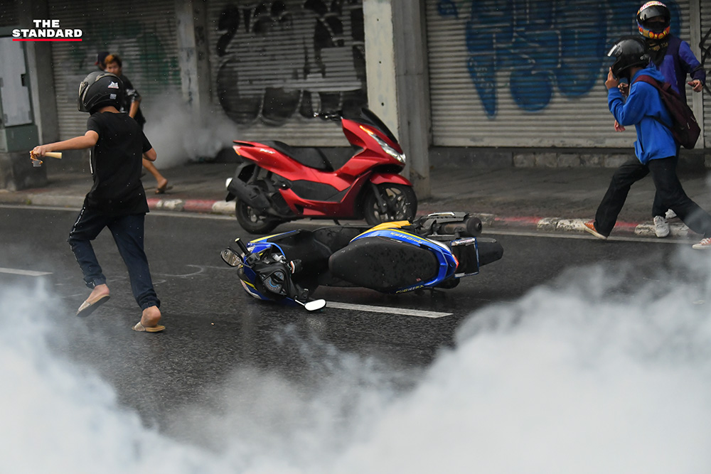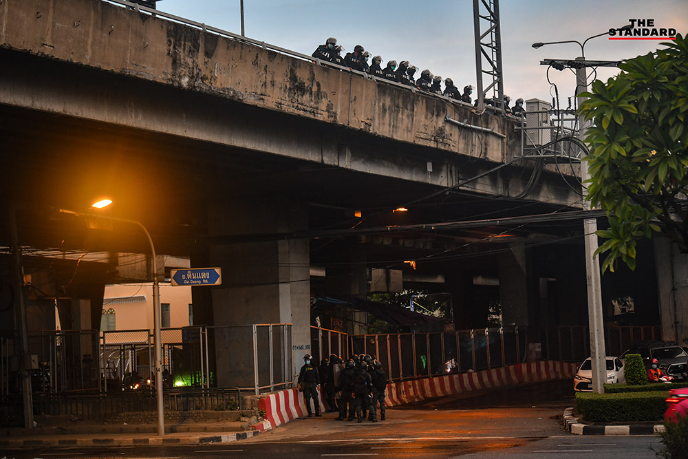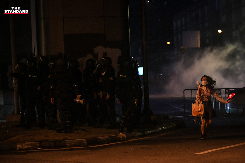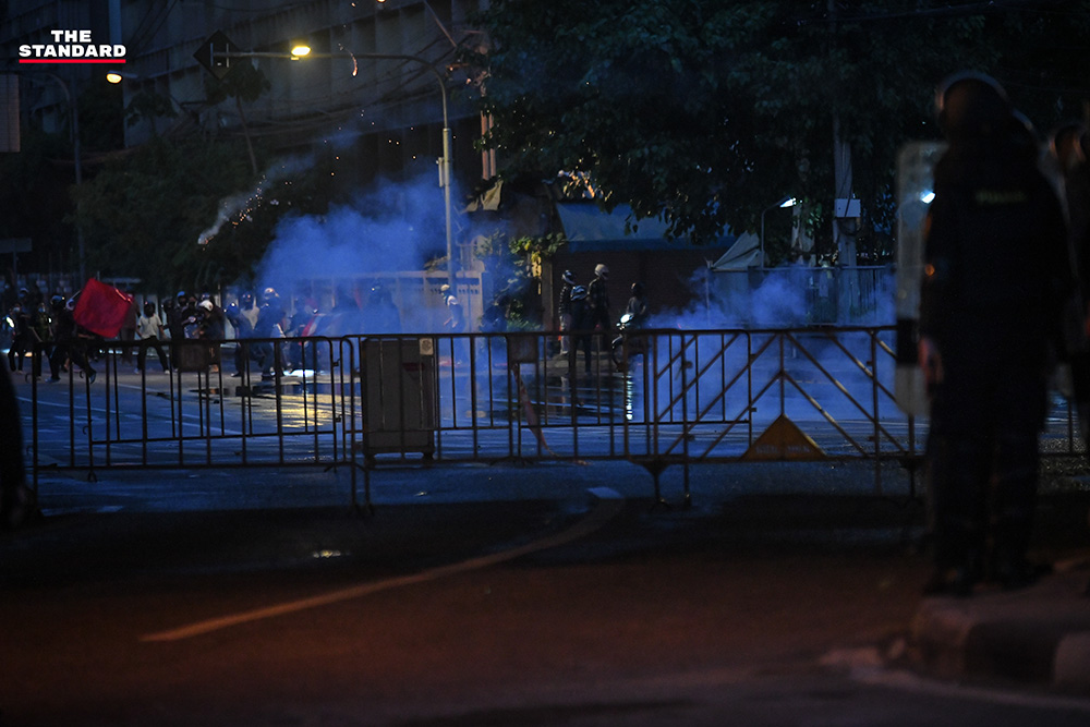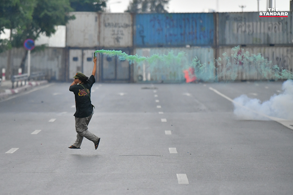 จากนั้นเจ้าหน้าที่ตำรวจควบคุมฝูงชน (คฝ.) ด้านหลังแนวตู้คอนเทนเนอร์บนถนนวิภาวดีรังสิตขาออกได้เริ่มยิงแก๊สน้ำตาใส่กลุ่มดังกล่าว