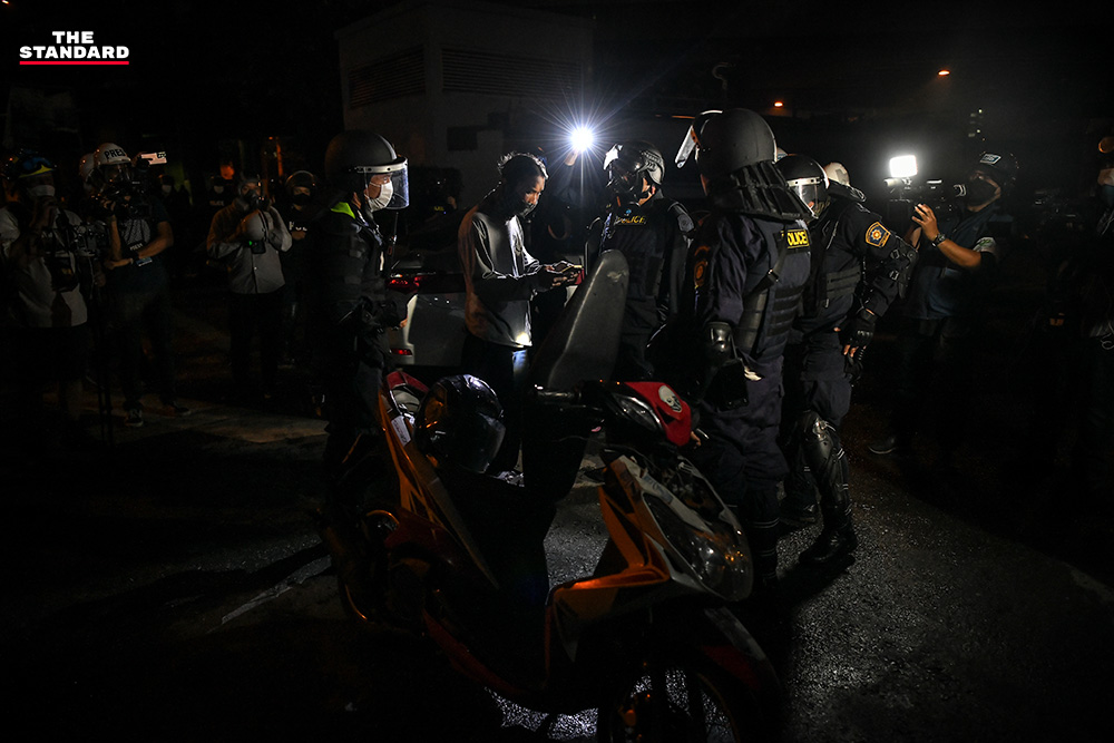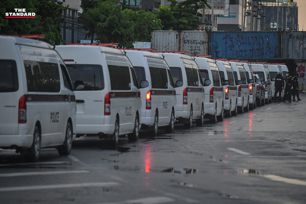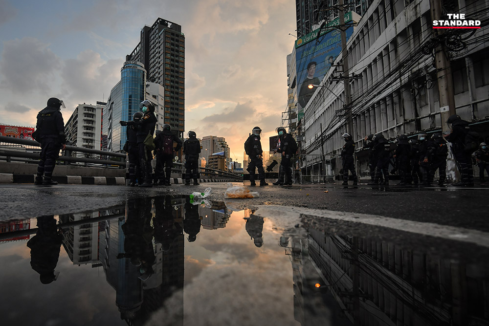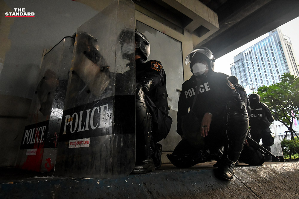 เวลา 17.50 น. คฝ. เข้ามาในพื้นที่โดยกระจายกำลังเดินสำรวจภาคพื้นและบางส่วนอยู่ประจำรถกระบะ นอกจากนี้ยังมีการวางกำลังเจ้าหน้าที่ตามสะพานลอยเพื่อสังเกตการณ์มุมสูงและวางกำลังรอบพื้นที่สามเหลี่ยมดินแดงเพื่อป้องกันกลุ่มวัยรุ่นดังกล่าวจะกลับมารวมตัวอีก