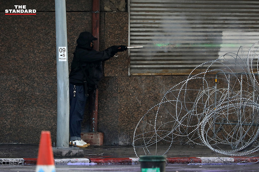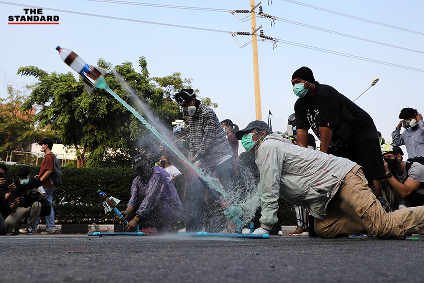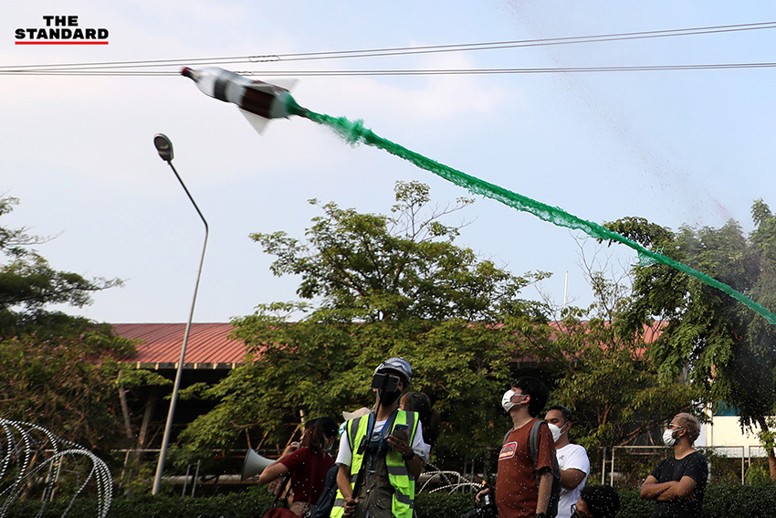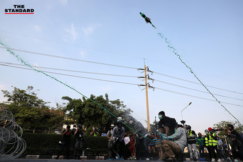 จากนั้นเวลา 16.30 น. กลุ่มผู้ชุมนุมนำแท่นยิงจรวดขวดน้ำพร้อมขว้างปาถุงใส่สีแดง ซึ่งเคยนำมาใช้ในการชุมนุมครั้งที่ผ่านมา ข้ามผ่านหลังแนวรั้วลวดหนามไปทางกลุ่มของฝั่งตำรวจ