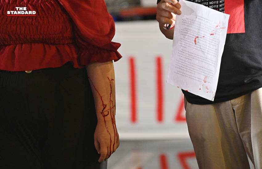 จากในเวลาต่อมา รุ้ง ปนัสยา ได้กรีดแขนตนเองเป็นข้อความ ‘112’ พร้อมปราศรัยระบุว่า ขอให้มวลชนร่วมกันต่อสู้จนกว่าจะได้มาซึ่งข้อเรียกร้อง และจะต่อสู้ด้วยแรงกายและแรงใจที่มี ก่อนจะชูสามนิ้ว จากนั้นได้มีอาสาสมัครพยาบาลนำตัวรุ้ง ปนัสยา ไปปฐมพยาบาลต่อ