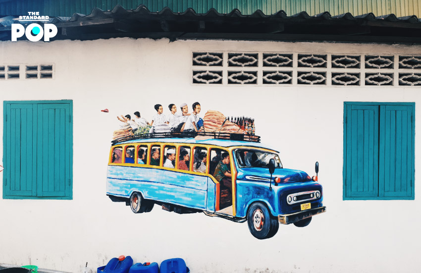 ใกล้กันไม่เกิน 10 ก้าวเดิน เป็นภาพรถโดยสารเฉพาะถิ่นรุ่นเก๋าของชาวเบตง ที่เรียก ‘รถสวน’ รูปนี้รถสวนกำลังขนซีอิ๊วและยางพารา ผลงานของ สุริยะ ฉายะเจริญ ซึ่งได้แรงบันดาลใจจากวิถีคนเบตงในสมัยก่อนที่เวลาจะเดินทางไปไหนต้องนั่งรถลักษณะนี้ และที่มาของชื่อรถสวน ก็เพราะเป็นรถที่พาชาวบ้านมุ่งหน้าสู่สวนยางพารา ส่วนบนหลังคารถที่มีลังซีอิ๊ว เพราะศิลปินต้องการสื่อถึงบ้านหลังนี้ที่เป็นโรงบ่มซีอิ๊วเก่าแก่ของอำเภอ