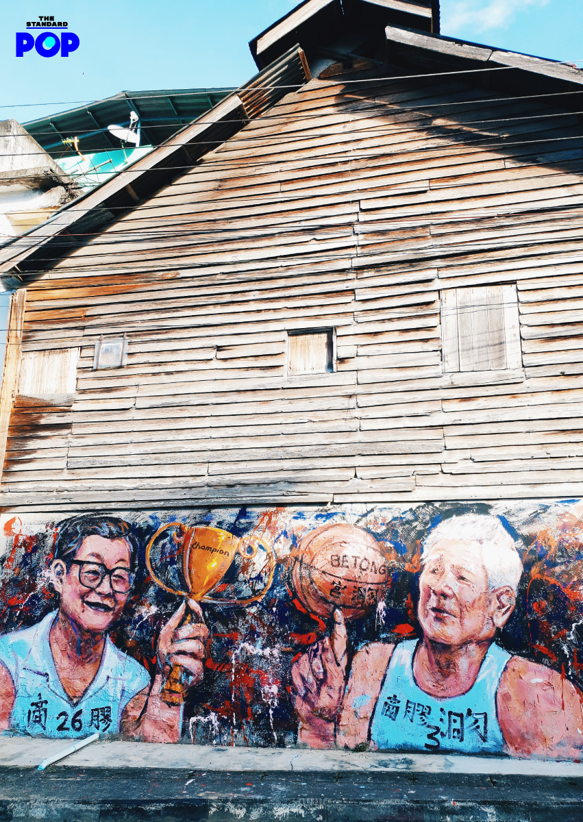 งานชิ้นต่อไปที่เราชอบมากคือ งานของ Alai หรือครูอะไหล่ ครูสอนศิลปะจากสถาบันสอนศิลปะ Viridian Academy of Art ผู้ที่เคยฝากงานสตรีทอาร์ตรัชกาลที่ 9 (Street Art King Bhumibol) ไว้บนกำแพงโรงเรียนอนุบาลประจำเมืองเบตงมาแล้ว ภาพนี้เป็นภาพที่ชาวเบตงมองแล้วอมยิ้มมากที่สุด เพราะเล่าถึงสมัยก่อนที่คนเบตงชอบเล่นบาสเกตบอลมาก มีสนามบาส และทีมบาสแข่งขันกันจริงจัง จนสามารถคว้าถ้วยรางวัลชนะเลิศที่เป็นทองคำแท้ คุณลุงคุณป้าเจ้าของถ้วยจึงนำถ้วยรางวัลไปขาย แล้วนำเงินมาบริจาคซื้อที่ดิน เมื่อสาธารณประโยชน์ของเมือง ปัจจุบันทั้งคู่ยังมีชีวิตอยู่ เรามีโอกาสได้พบทั้งสองท่านด้วย และพบว่า ท่านรู้สึกมีความสุขมากที่หลายคนยังจำได้ และเข้าไปทักทาย