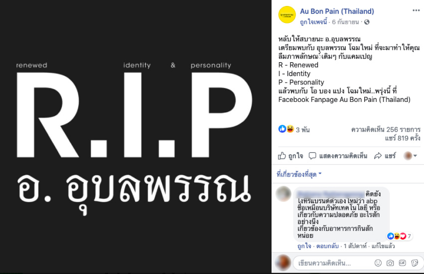 หากจำกันได้ช่วงสุดสัปดาห์ก่อน (6 กันยายน) ได้มีเสียงอื้ออึงเกิดขึ้นในโลกออนไลน์ เมื่อ Au Bon Pain (โอบองแปง) ร้านอาหารและคาเฟ่สัญชาติอเมริกัน ที่อยู่ในไทยกว่า 20 ปี ได้โพสต์ผ่าน Facebook Fanpage ‘Au Bon Pain (Thailand)’ ว่า ‘หลับให้สบายนะ อ.อุบลพรรณ เตรียมพบกับ อุบลพรรณ โฉมใหม่ ที่จะมาทำให้คุณลืมภาพลักษณ์เดิมๆ กับแคมเปญ R-Renewed I-Identity P-Personality’
