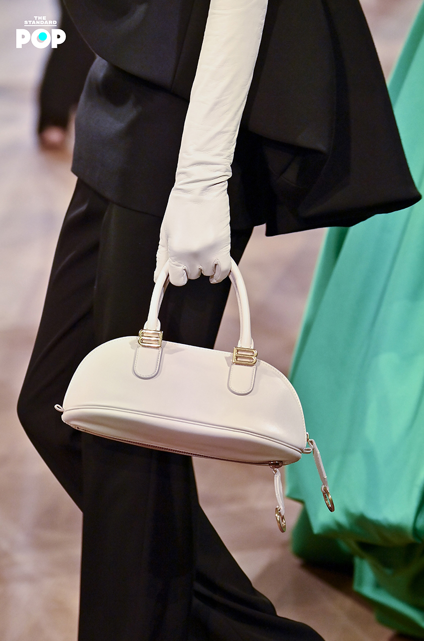 ตัวเสื้อผ้าเลยกลายเป็นส่วนผสมของซิลูเอตต์แบบดั้งเดิมจากในคลัง ไม่ว่าจะเป็นชุด Sack Dress แบบพองลมจากปี 1957 ชุดเดรสดีเทลสายเข็มขัดที่ดูโมเดิร์นขึ้น แต่ผสมความเรียบง่ายและสีสันที่คลาสสิก ส่วนอิทธิพลของ Demna จะมาในรูปแบบของแอ็กเซสซอรีที่เราเห็นทันทีก็รู้ว่าใครเคยใส่ ไม่ว่าจะเป็นแว่นตากันแดดสีดำแบบเอเลี่ยนที่ Kim Kardashian ชอบ และปิดท้ายโชว์ด้วย Pierpaolo ออกมาขอบคุณท้ายโชว์ในรองเท้าสนีกเกอร์ 3XL ส่งสัญญาณว่าแบรนด์นี้จะส่งไม้ต่อกันแบบค่อยเป็นค่อยไป แบบไม่ทิ้งผลงานเก่าของใครไว้ข้างหลัง