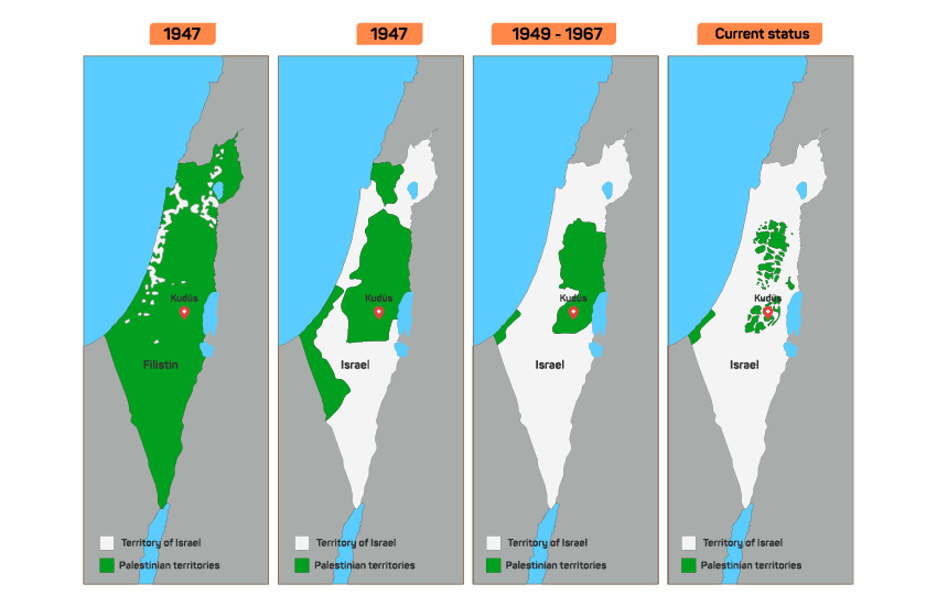นอกจากนั้นอิสราเอลยังได้สร้างและขยายถิ่นฐานสำหรับชาวยิวเข้าไปในดินแดนปาเลสไตน์มากขึ้นเรื่อยๆ อย่างผิดกฎหมาย ทำให้ปัจจุบันมีชาวยิวที่ไปสร้างนิคมในเขตปาเลสไตน์มากกว่า 4 แสนคน และยังมีอีกจำนวนหนึ่งเข้าไปอยู่อาศัยในเยรูซาเลมด้วย หากดูจากแผนที่จะเห็นว่าดินแดนของปาเลสไตน์ตั้งแต่ก่อนที่จะมีการตั้งรัฐอิสราเอลมาจนถึงปัจจุบันจะพบว่าลดน้อยลงมากหรือแทบจะไม่เหลือแล้ว แต่ในส่วนของอิสราเอลได้ขยายออกไปกินพื้นที่เกือบทั้งหมด