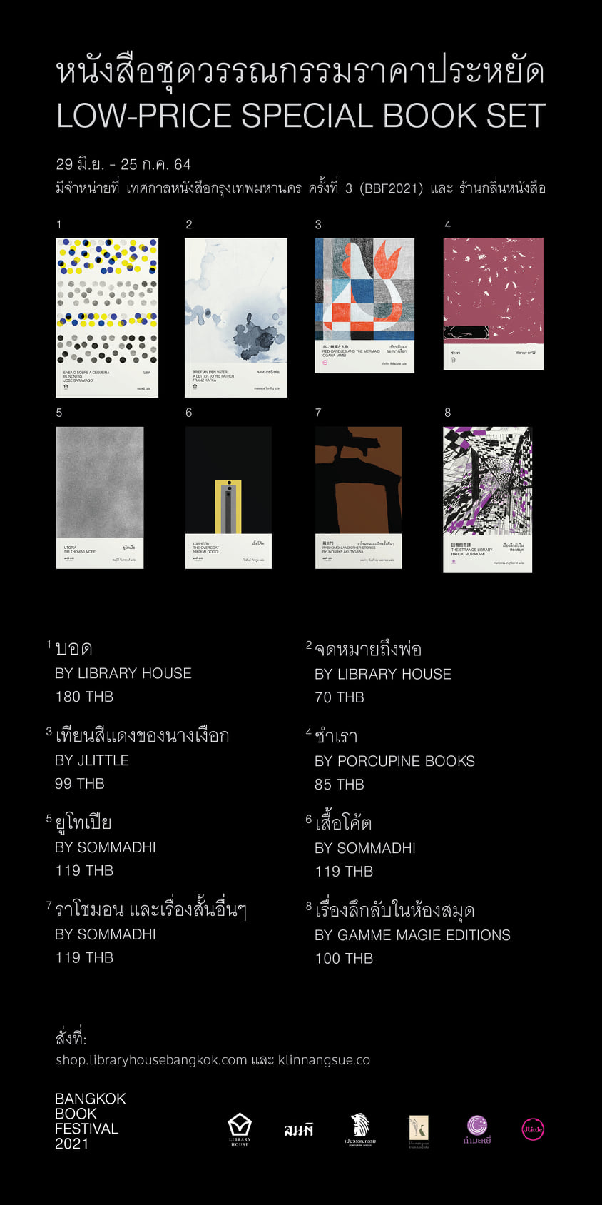 ถ้าสังเกตดูดีๆ เห็นได้ว่ามีธีมบางที่เชื่อมต่อและหลอมรวมหนังสือทั้ง 8 เล่มเอาไว้ด้วยกัน อาจจะเป็นเรื่องราวของโลกในอุดมคติ ภาพสะท้อนระบบอันบิดเบี้ยว การตั้งคำถามกับสังคม หรือความเซอร์เรียลในหนังสือที่กำลังกลายเป็นความจริง ณ ที่ใดสักแห่งใกล้ๆ ตัวเรา ส่วนความพิเศษอีกอย่างหนึ่งคือภาพปกที่สร้างสรรค์ขึ้นมาใหม่เพื่อ BBF2021 โดยเฉพาะ เก็บสะสมเป็น Collectible Items ก็ยังได้ สามารถ Pre-order หนังสือชุดวรรณกรรมราคาประหยัดได้แล้วตั้งแต่วันนี้ถึง 25 กรกฎาคมนี้ ที่ Library House Shop และ ร้านกลิ่นหนังสือ