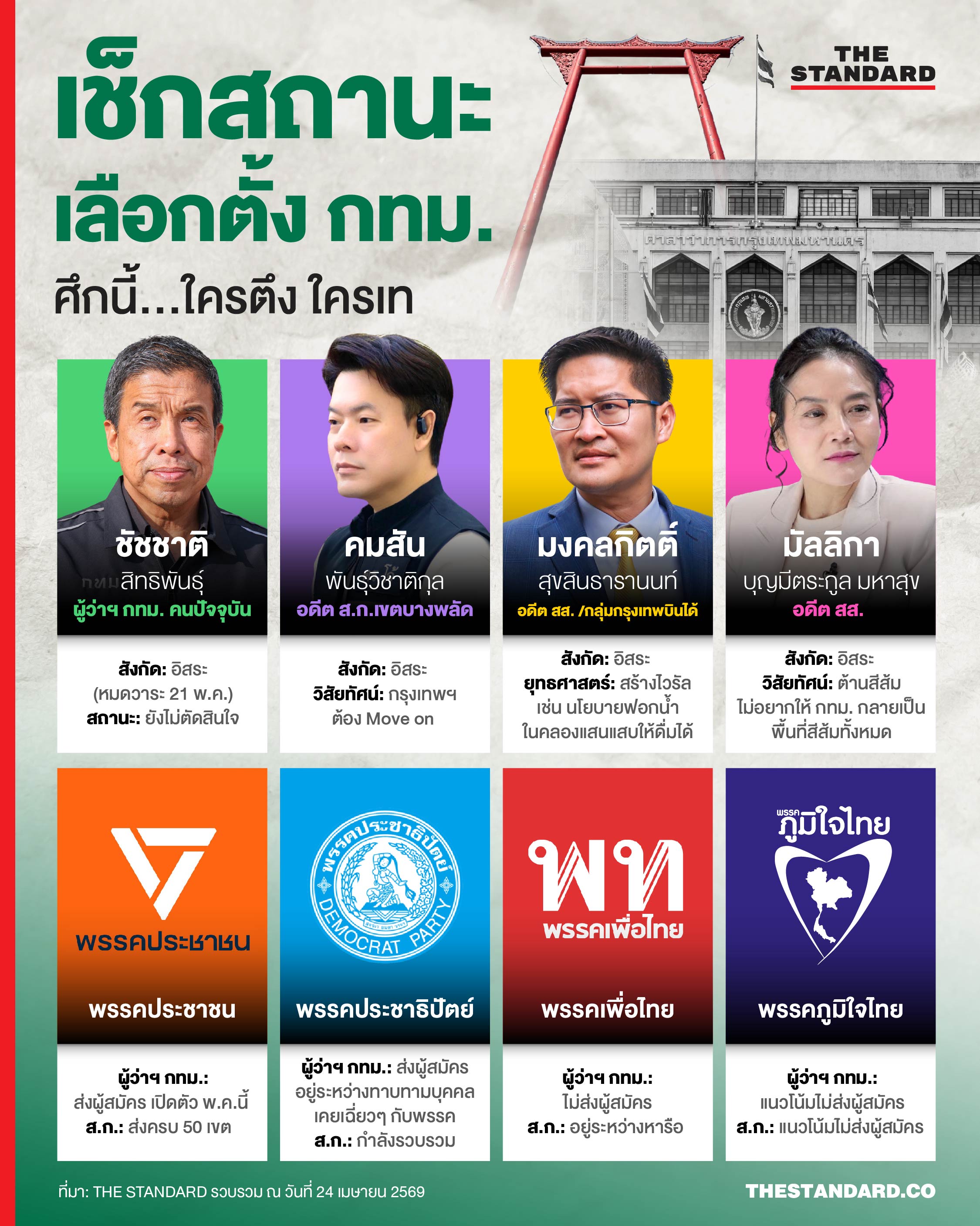 นับถอยหลังอีกเพียง 2 เดือนสู่ศึกชิง ‘สมรภูมิเมืองหลวง’ เมื่อ ชัชชาติ สิทธิพันธุ์ ผู้ว่าฯ กทม. คนปัจจุบัน กำลังจะหมดวาระลงในวันที่ 21 พฤษภาคมนี้ ก่อนส่งไม้ต่อสู่วันหย่อนบัตรเลือกตั้งผู้ว่าฯ กทม. และ ส.ก. ในวันที่ 28 มิถุนายน 2569 ตามประกาศของ กกต.