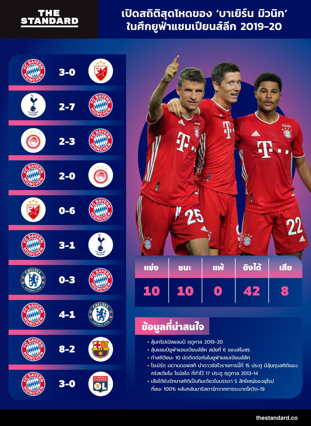 THE STANDARD รวมผลงานและผลการแข่งขันของบาเยิร์น มิวนิก มาให้ดูกันว่าตลอดการแข่งขันตั้งแต่รอบแบ่งกลุ่มจนถึงรอบน็อกเอาต์รวม 10 นัดที่ผ่านมา พวกเขาได้รังสรรค์ผลงานเอาไว้ตลอดทัวร์นาเมนต์อย่างไรบ้าง
