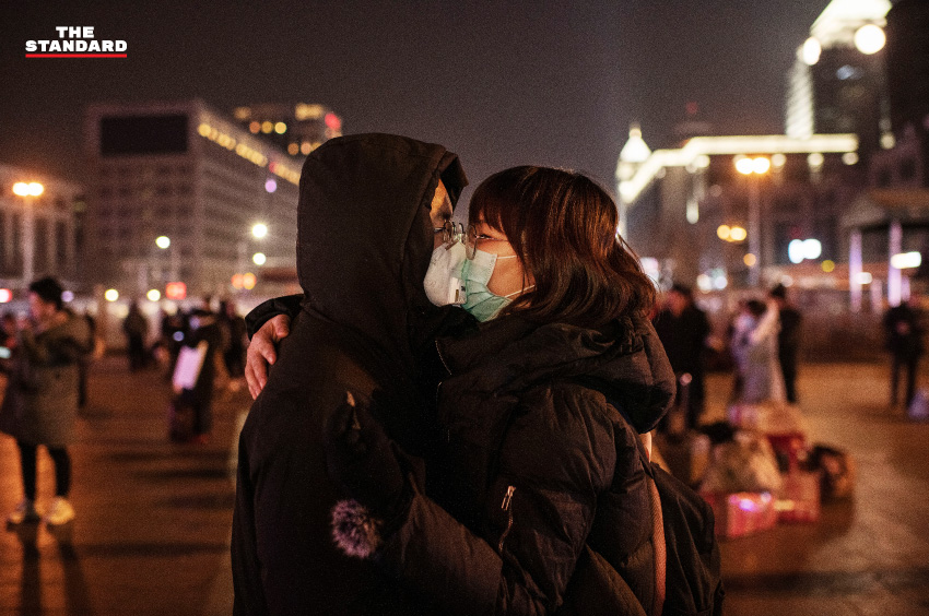 คู่รักชาวจีนจูบกันโดยที่ยังสวมหน้ากากอนามัยอยู่ ก่อนที่ทั้งสองจะจากลากันเพื่อขึ้นรถไฟที่สถานีรถไฟปักกิ่งในช่วงเทศกาลตรุษจีน ท่ามกลางความวิตกกังวลเกี่ยวกับการระบาดของไวรัสโคโรนาสายพันธุ์ใหม่ ซึ่งทำให้บรรยากาศการเฉลิมฉลองในหลายพื้นที่ของจีนค่อนข้างเงียบเหงา