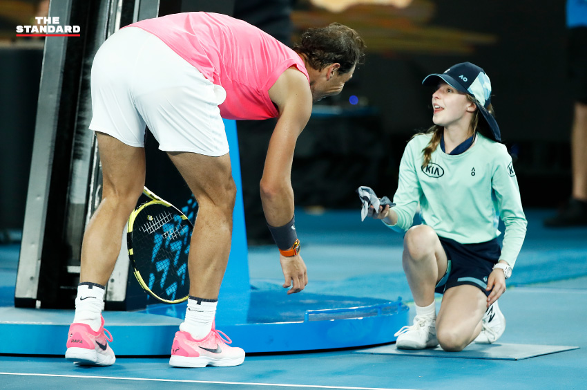 ราฟาเอล นาดาล นักเทนนิสมือ 1 ของโลก มอบผ้าคาดศีรษะให้กับบอลเกิร์ลหลังจบการแข่งขันเทนนิสรายการออสเตรเลียน โอเพ่น โดยระหว่างเซตที่ 3 ในเกมพบกับ เฟเดริโก เดลโบนิส คู่แข่งชาวอาร์เจนตินา นาดาลตีลูกรีเทิร์นพลาดไปถูกใบหน้าของบอลเกิร์ลที่ยืนอยู่กับแชร์อัมไพร์เข้าอย่างจัง ซึ่งเขาได้เข้าไปขอโทษเด็กสาวทันที พร้อมหอมแก้มเป็นการปลอบใจ ซึ่งเรียกเสียงเชียร์และชื่นชมไปทั้งสนาม