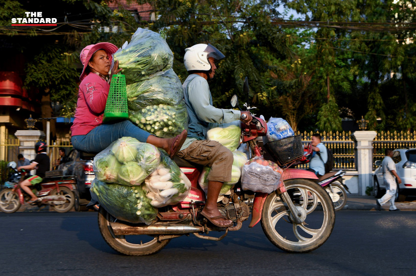 หญิงชาวกัมพูชานั่งซ้อนท้ายมอเตอร์ไซค์โดยมีถุงผักกองโต ขณะเดินทางบนถนนในกรุงพนมเปญ